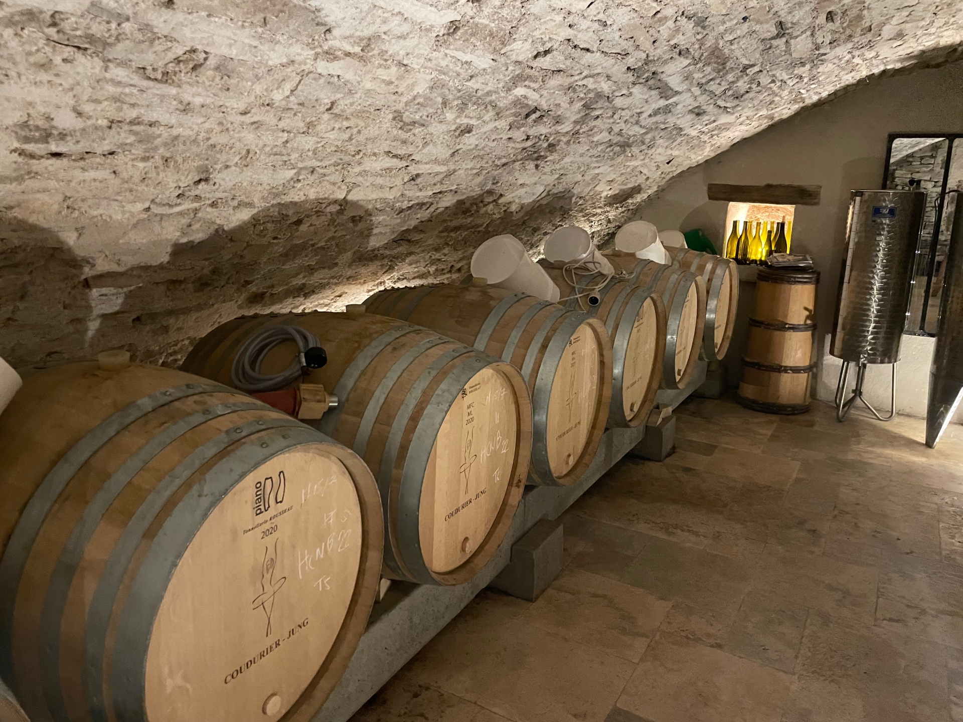 Les locaux ont pignon sur rue, situés rue du Faubourg Bretonnière en plein centre-ville. Ils accueillent l’espace de vente du vin directement vinifiés à l’étage inférieur, dans les caves. Dès les premières marches descendues, l’odeur au parfum floral et boisé ne trompe pas : une fermentation s’opère bien ici-bas.