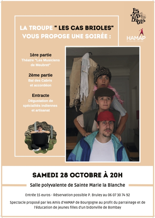 HAMAP Humanitaire Bourgogne organise un événement pour récolter des fonds au profit du parrainage et de l'éducation de jeunes filles d'un bidonville de Bombay le samedi 28 octobre à 20 h à la salle polyvalente de Sainte Marie la Blanche. La troupe de rue issue du Conservatoire de Besançon « Les Cas brioles » propose une soirée spectacles avec en 1re partie du théâtre avec « Les Musiciens de Meubret » et en 2e partie le bal des Cabris et accordéon.