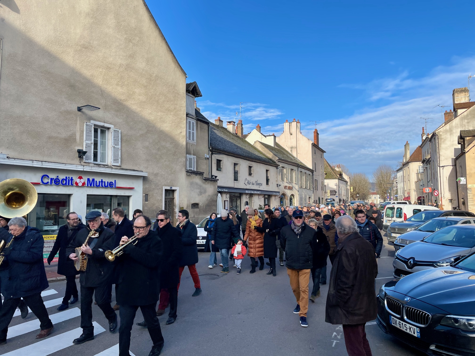 À la sortie de la messe, un grand défilé a pris forme, animé par les musiciens de Jazz O’Verre. Benjamin Leroux et Lauriane André, portant fièrement la statue de Saint-Vincent, ont symbolisé la passation entre les domaines. Le domaine Benjamin Leroux, reconnu pour ses vins biologiques de qualité exceptionnelle, a été le gardien de la statue durant l'année 2023.