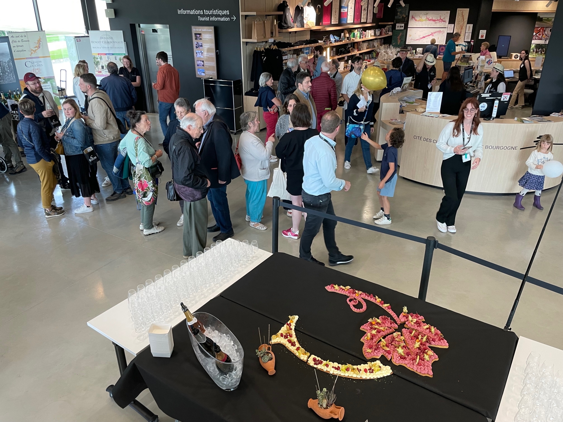 Le point culminant des célébrations a eu lieu samedi à 15 h 30 avec une surprise gourmande : le soufflage des bougies d'un gâteau d'anniversaire. Confectionné par Christophe Maisières, chef du restaurant de la Cité des Climats et Vins de Bourgogne à Beaune et ambassadeur « Savoir-faire 100% Côte-d'Or », ce gâteau a ravi les visiteurs. Inspiré du logo de la Cité, il reposait sur une base de pâte feuilletée agrémentée d’une mousse à la framboise et à la vanille, le tout accompagné de bougies et d'un groupe de musiciens.