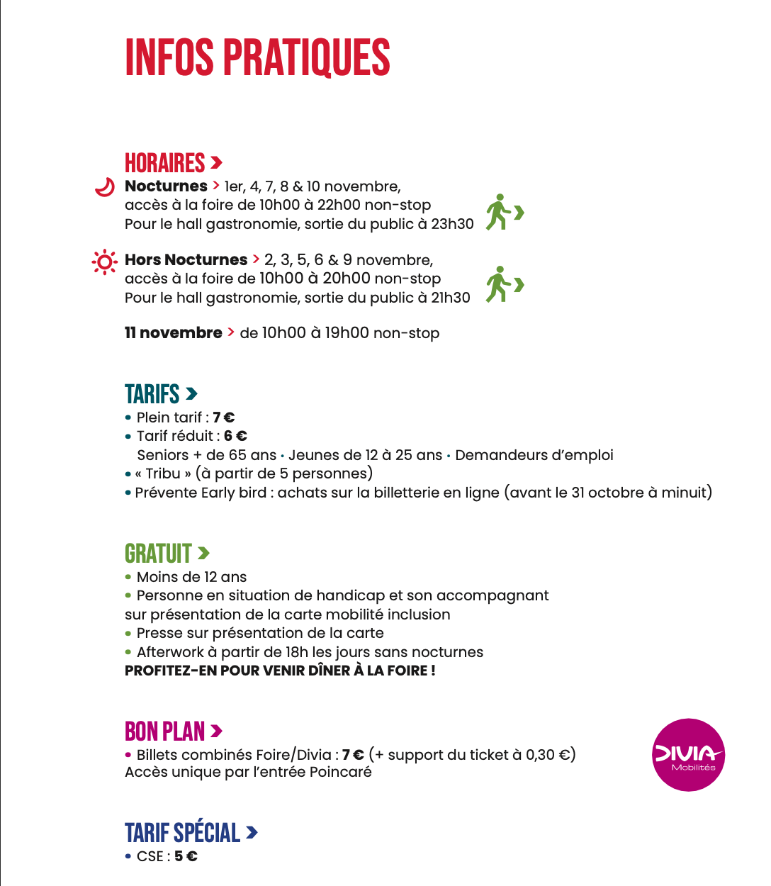 Depuis plusieurs années, Dijon Bourgogne Events déploie une stratégie écoresponsable pour faire de la Foire un événement durable. L’édition 2025 accentue cet engagement avec la réduction et valorisation des déchets, la diminution des plastiques et l’utilisation accrue de matériaux recyclés, une politique d’accessibilité renforcée, avec la gratuité pour les personnes en situation de handicap et leur accompagnant, la promotion des mobilités douces grâce au Pass Foire-Divia, facilitant l’accès en transports en commun.