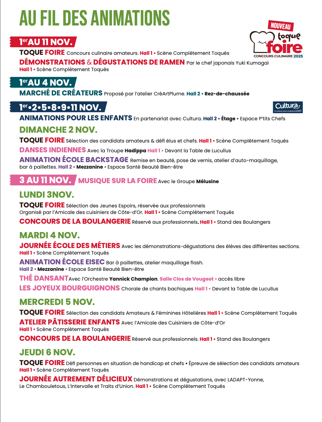 Toque Foire (nouveauté) : un concours phare qui réunit amateurs, jeunes talents, élus et chefs confirmés, jusqu’à une grande finale le 11 novembre.