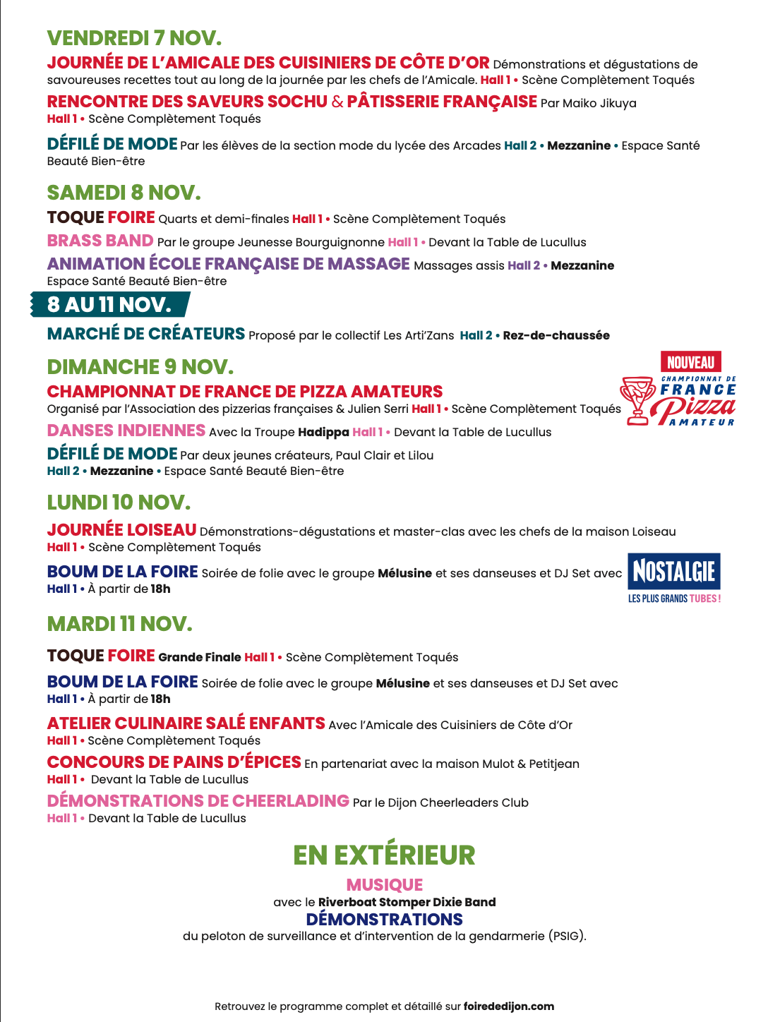 Championnat de France de Pizza Amateurs (nouveauté) : le 9 novembre, les meilleurs pizzaiolos amateurs de l’Hexagone s’affronteront devant un jury de professionnels, organisé avec Julien Serri et l’Association des pizzerias françaises. La veille, une soirée pizza viendra chauffer l’ambiance.
