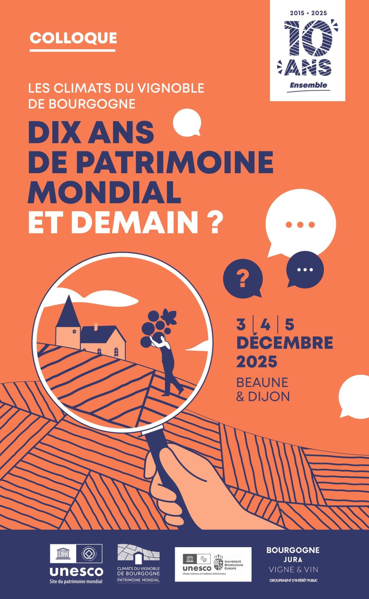 Dernier temps fort de cette année anniversaire, un grand colloque international est organisé les 3, 4 et 5 décembre 2025, à Beaune et à Dijon, autour du thème : « Les Climats du vignoble de Bourgogne : 10 ans de Patrimoine mondial. Et demain ? ».