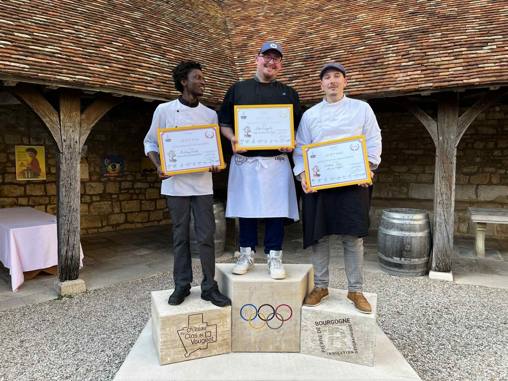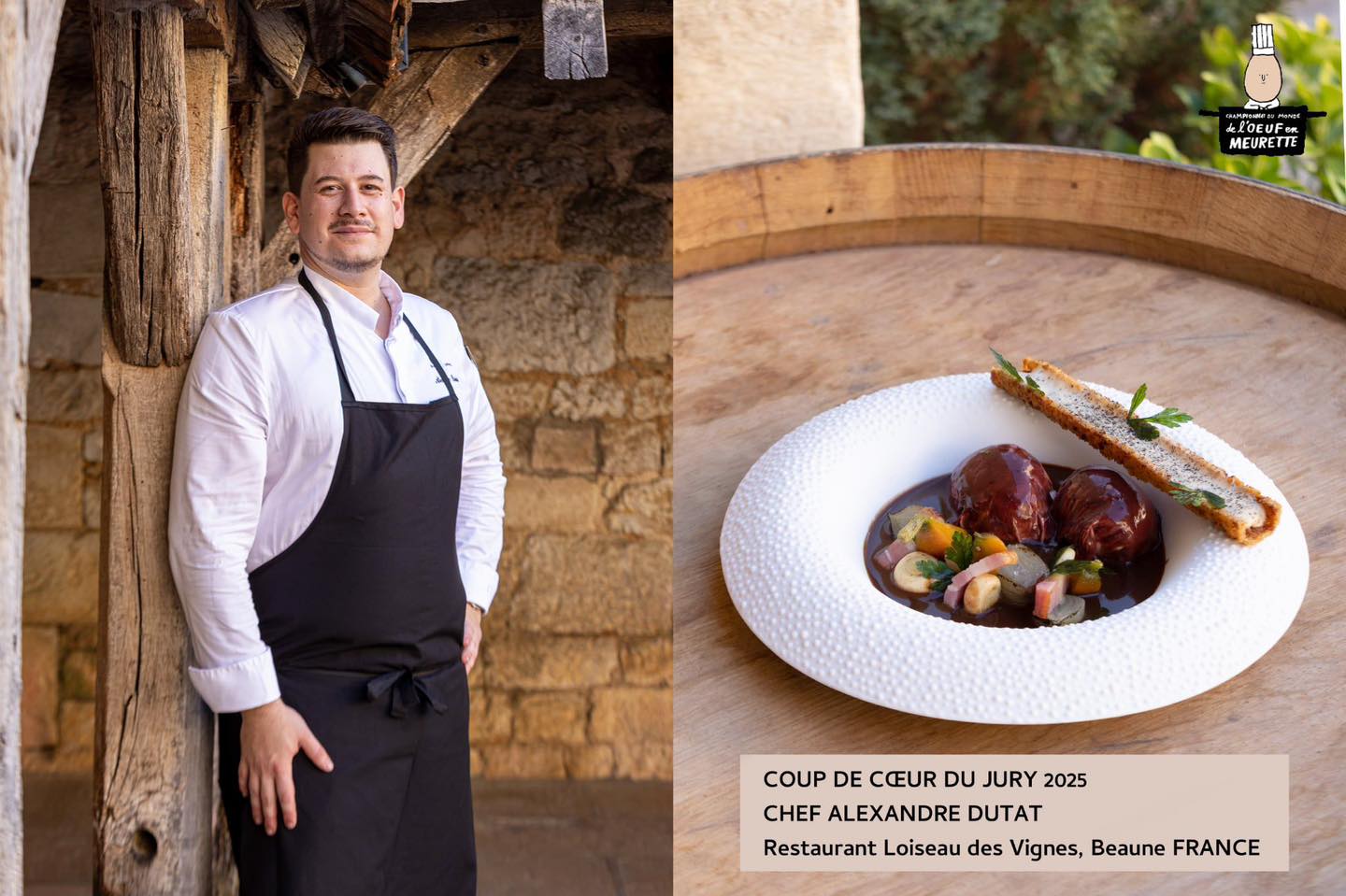 Le coup de cœur 2025 revient au chef Alexandre Dutat, du restaurant Loiseau des Vignes à Beaune, pour une interprétation créative et audacieuse : « Un œuf en meurette glacé à la sauce au vin rouge et beurre de cassis, croûton d’espuma au lard et oignons confits », détaille la présidente du jury, saluant « une approche subtile entre terroir et modernité ».