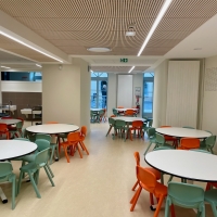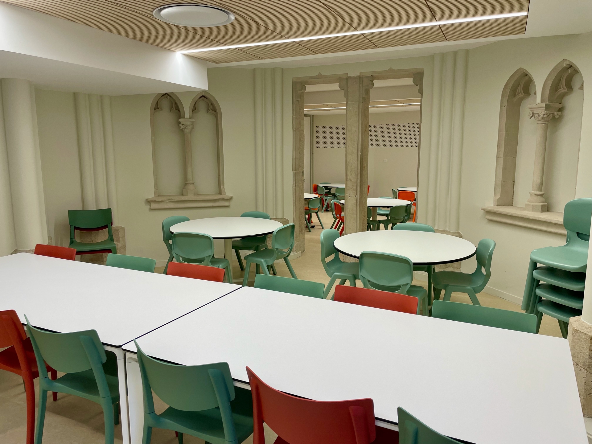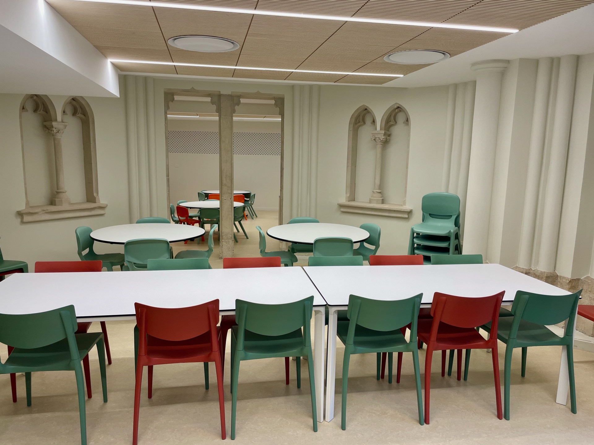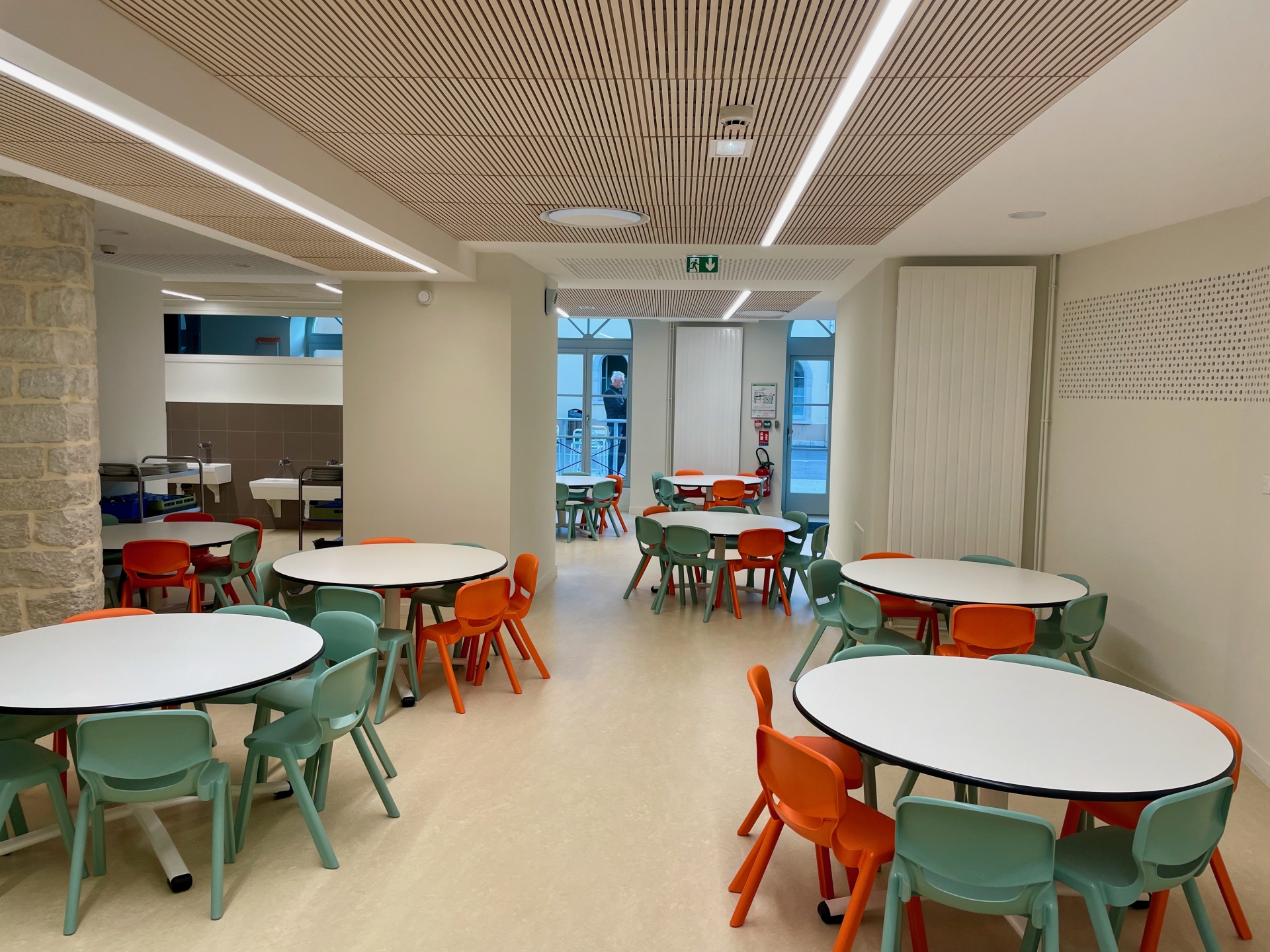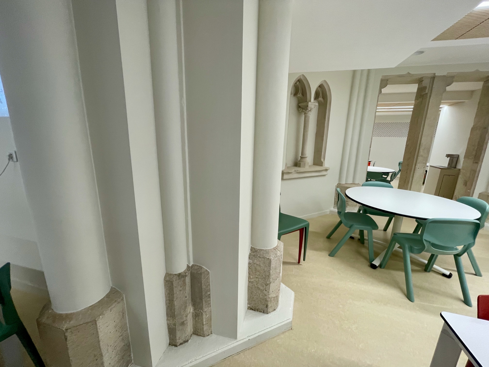 L’aménagement intérieur a su préserver les traces du passé : les baies géminées, les colonnes engagées, les piliers en pierre témoignent encore de l’esprit de la chapelle d’origine. L’ensemble est sublimé par une décoration sobre et contemporaine, des tons doux et lumineux et une excellente isolation acoustique, pensée pour créer « une atmosphère apaisante, propice au bien-être des élèves ». « Cette salle est un cadre de restauration, mais aussi un lieu de vie, de partage et de convivialité, au service des élèves et de toute la communauté éducative », ont insisté les deux responsables.