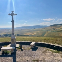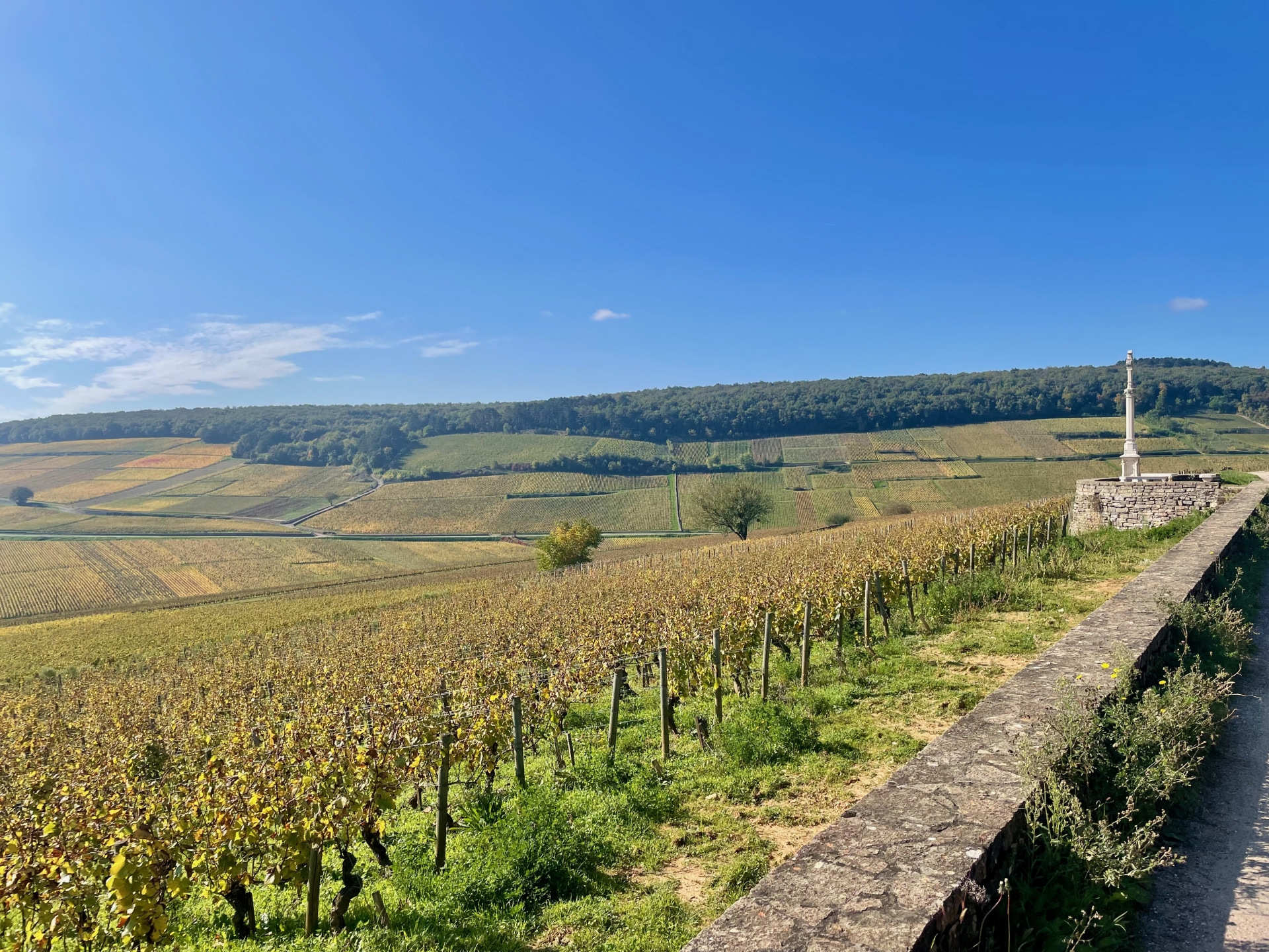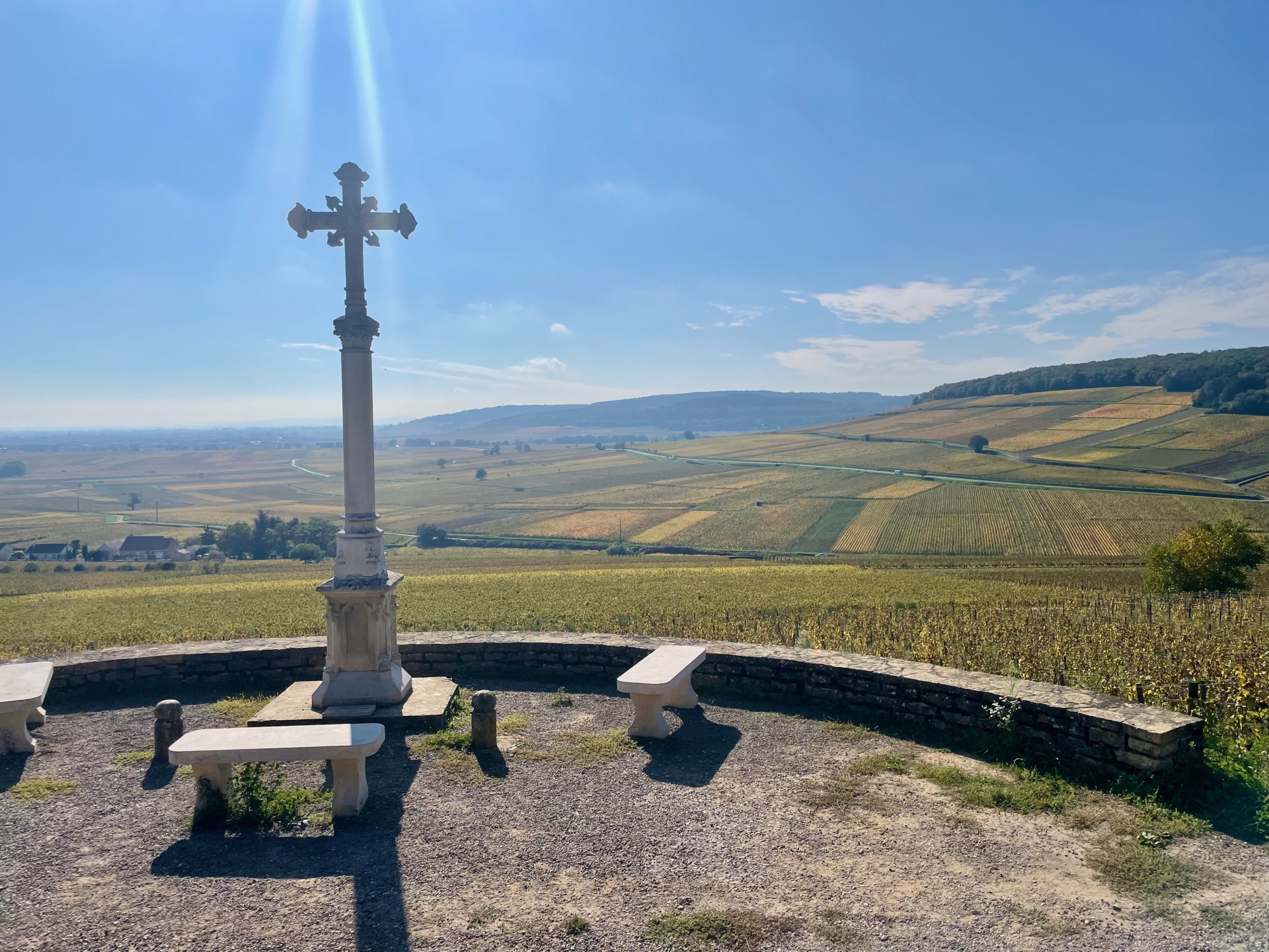 Au détour du chemin, la croix de Charlemagne se dresse, emblème de la colline. Depuis le belvédère de la Vierge de Sous Frétille, à Pernand-Vergelesses, le panorama s’ouvre sur les toits bourguignons, les vignes aux mille nuances et la plaine dorée.