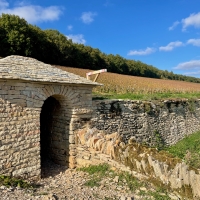 Parmi les trésors à découvrir, les cadolles, ces petites cabanes en pierres, témoins des travaux anciens de la vigne, servaient d’abris pour les vignerons, de vestiges de clôtures, de protections. Sur le parcours la magnifique cabote au cœur des Languettes, un peu plus haut une cadolle en pierre sèche restaurée selon les règles de l’art sur la parcelle du Domaine Bouchard Père & Fils, dans le climat Corton-Charlemagne. Cette petite construction, typique du patrimoine viticole, a retrouvé son allure d’origine : pierres taillées, taille juste, toiture remodelée pour retrouver l’emprise originale. Elle s’intègre presque parfaitement au paysage, et ajoute une touche patrimoniale précieuse à la randonnée.