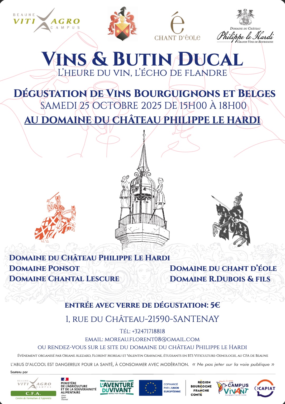 Les festivités se poursuivent au Domaine du Château Philippe le Hardi ! Le samedi 25 octobre, de 15 h à 18 h, le château accueillera Vins & Butin Ducal, un salon de dégustation original mêlant vins bourguignons et belges.