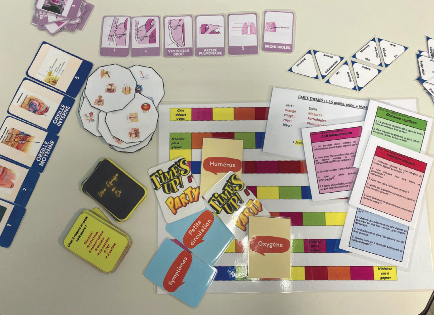 La boîte Soigne tes révisions regroupe huit jeux différents, conçus autour des thématiques clés de la formation en santé : anatomie, physiologie, pathologie, pharmacologie, vocabulaire médical, paramètres vitaux, etc.