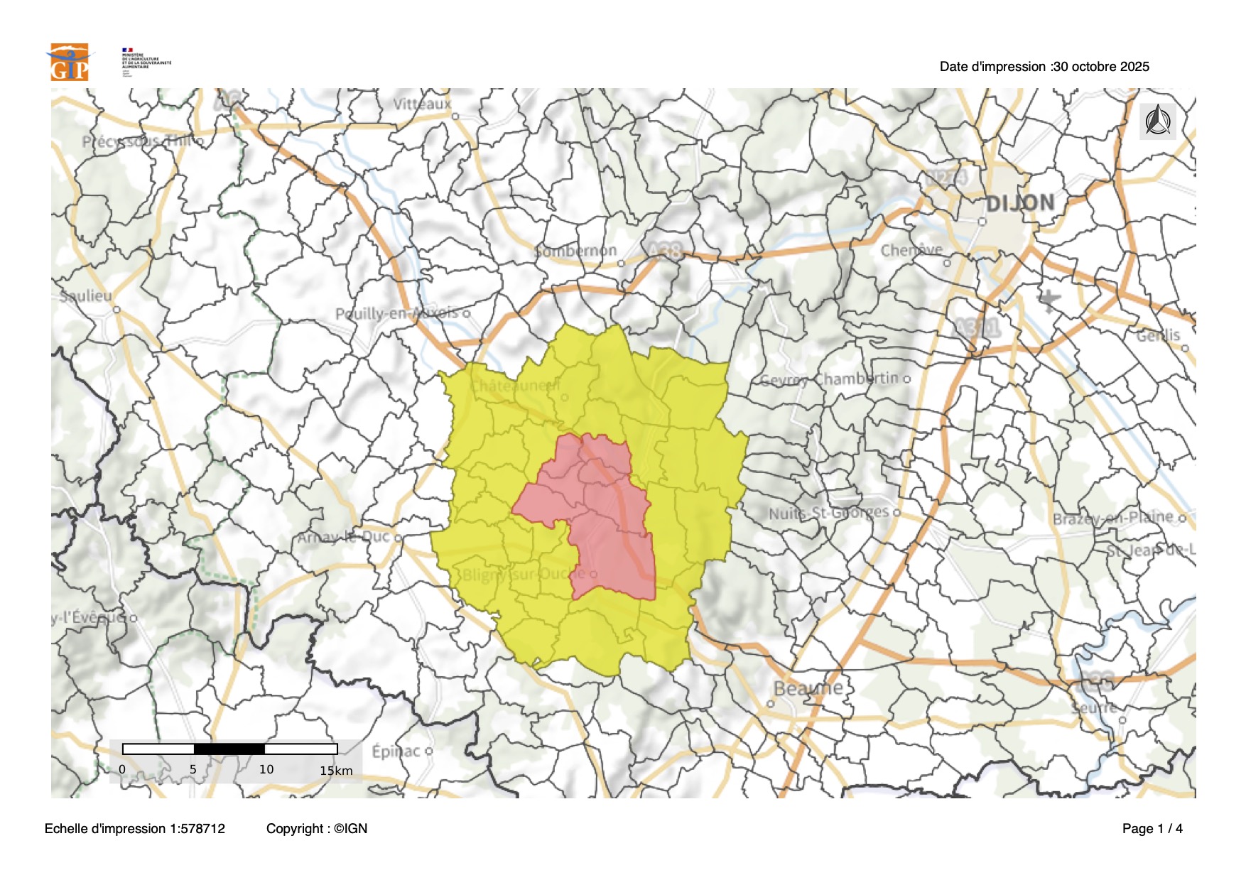 Les 33 communes supplémentaires concernées par la zone de 10 km, outre les 7 communes citées précédemment sont : Antheuil, Antigny-la-Ville, Aubaine, Auxant, Bessey-en-Chaume, Bessey-la-Cour, Bouhey, Bouilland, La Bussière-sur-Ouche, Châteauneuf, Chazilly, Commarin, Culètre, Cussy-le-Châtel, Détain-et-Bruant, Écutigny, Foissy, Longecourt-lès-Culêtre, Lusigny-Sur-Ouche, Maconge, Mavilly-Mandelot, Meilly-Surrouvres, Montceau-Et-Écharnant, Rouvres-sous-Meilly, Saint-Jean-de-Bœuf, Sainte-Sabine, Saint-Victor-sur-Ouche, Saussey, Thomirey, Vandenesse-en-Auxois, Veilly, Veuvey-sur-Ouche, Vic-des-Prés