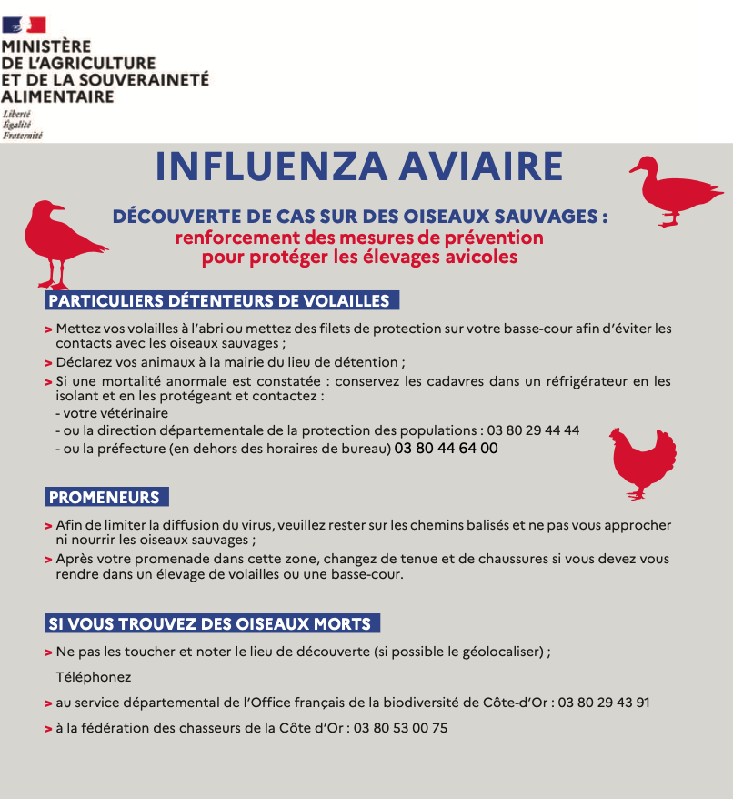 La surveillance de l’avifaune sauvage par le réseau SAGIR est renforcée et toute mortalité d’oiseaux sauvages dans cette zone, sans cause évidente, doit être signalée au réseau SAGIR auprès de :