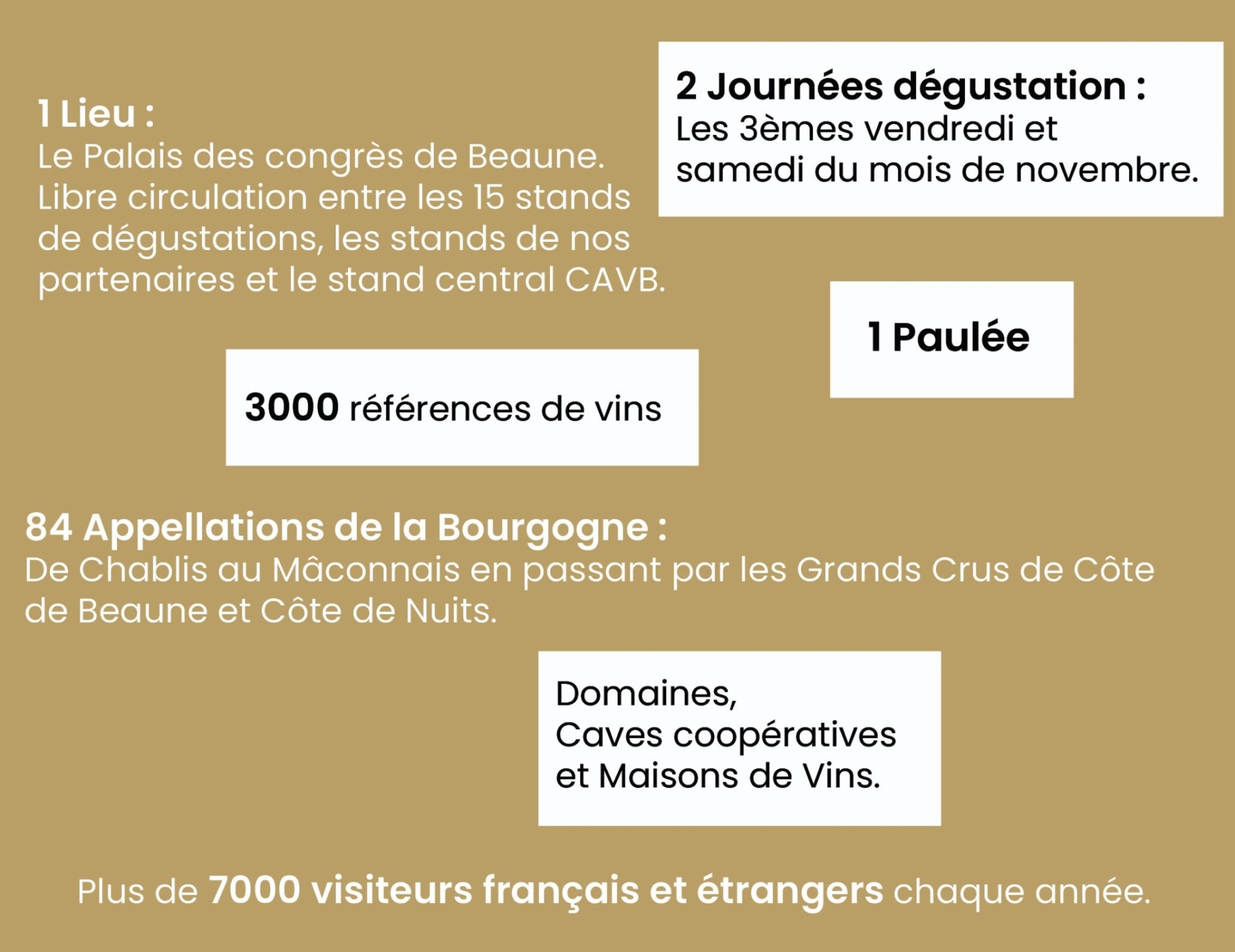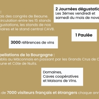 Sur le stand central de la CAVB, les visiteurs peuvent également situer chaque appellation sur la carte des sous-régions viticoles, se renseigner sur l’histoire de la Fête et profiter d’une restauration légère (gougères, planches, sandwiches). 15 pôles, 84 appellations, 3 000 références : en un seul lieu, toute la Bourgogne s’offre à la dégustation.