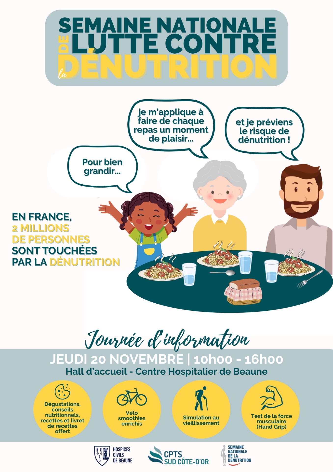 À l’occasion de la Semaine nationale de lutte contre la dénutrition, le service diététique des Hospices Civils de Beaune organise une journée d’information le mercredi 20 novembre, de 10 h à 16 h, dans le hall d’accueil du Centre Hospitalier de Beaune.