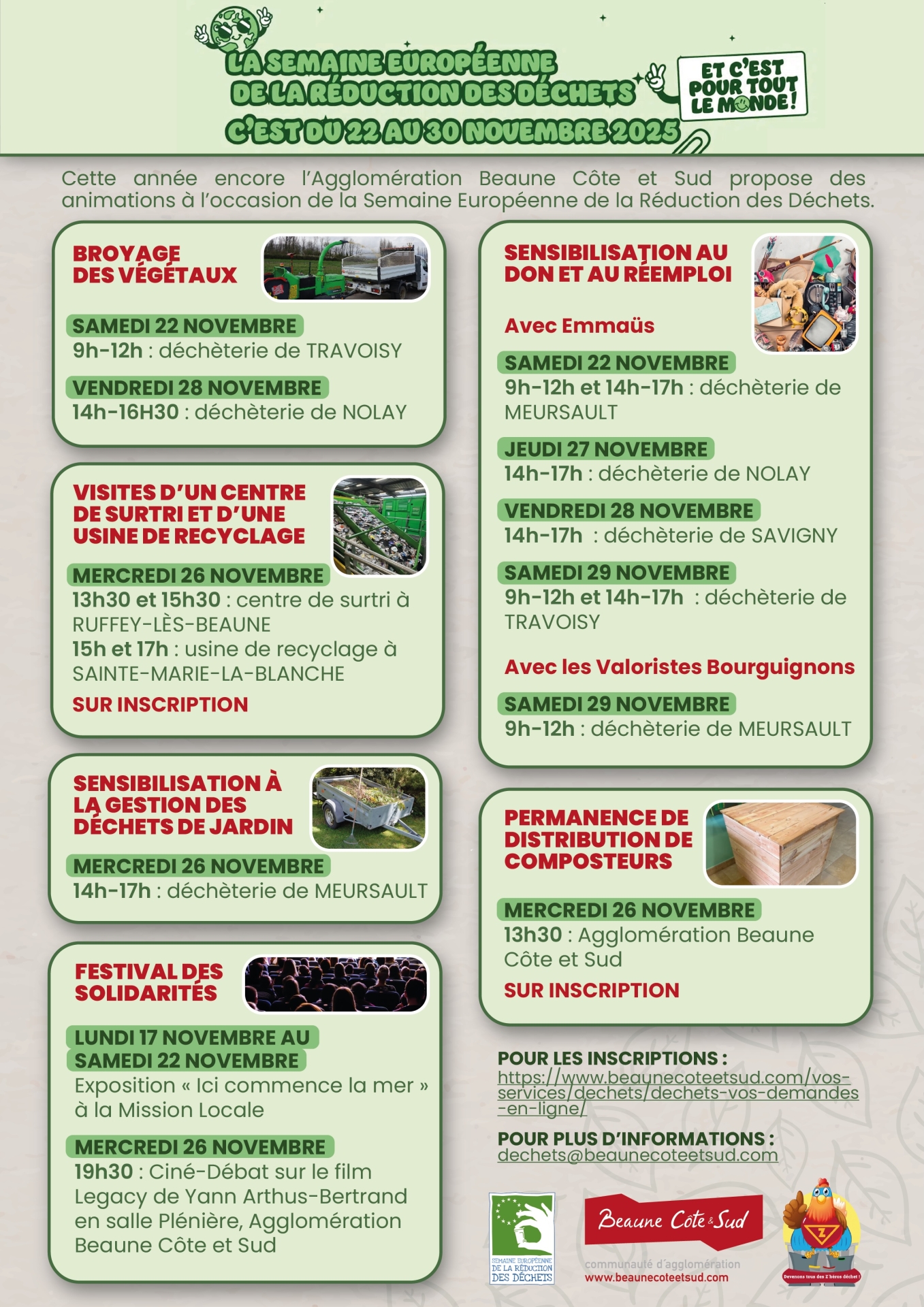 Comme chaque année, l’Agglomération Beaune Côte et Sud participe activement à la Semaine Européenne de la Réduction des Déchets (SERD), qui se déroulera du 22 au 30 novembre 2025. Objectif : sensibiliser le grand public à la prévention des déchets, au réemploi et au recyclage, à travers un programme riche et accessible à tous.