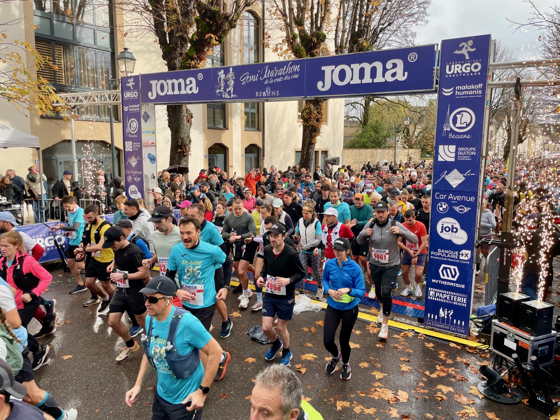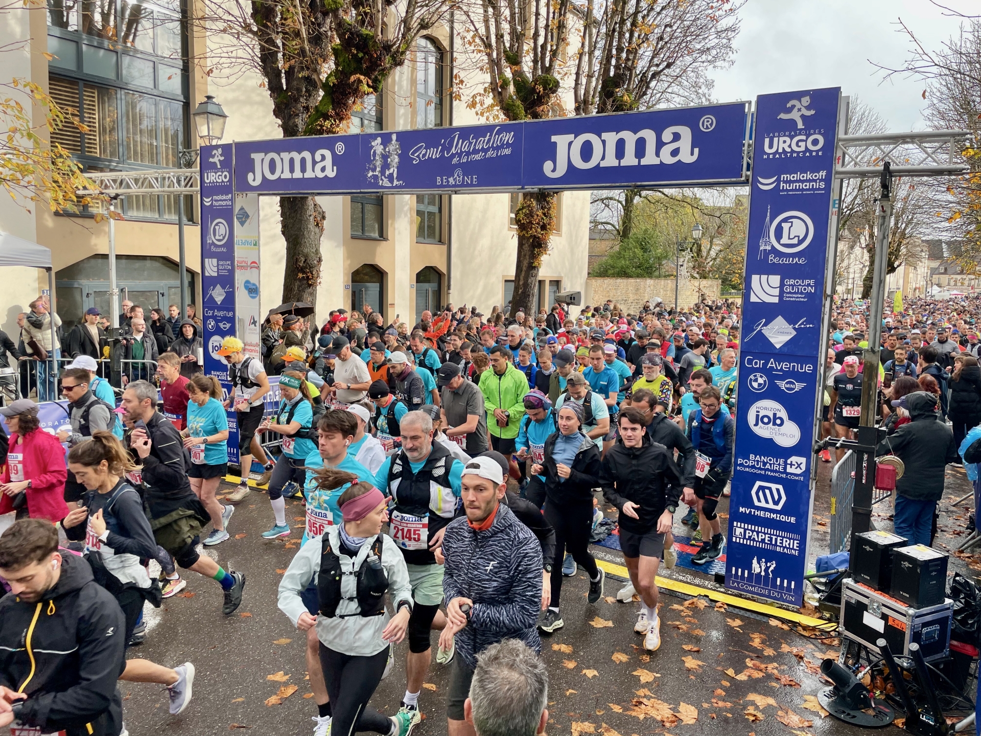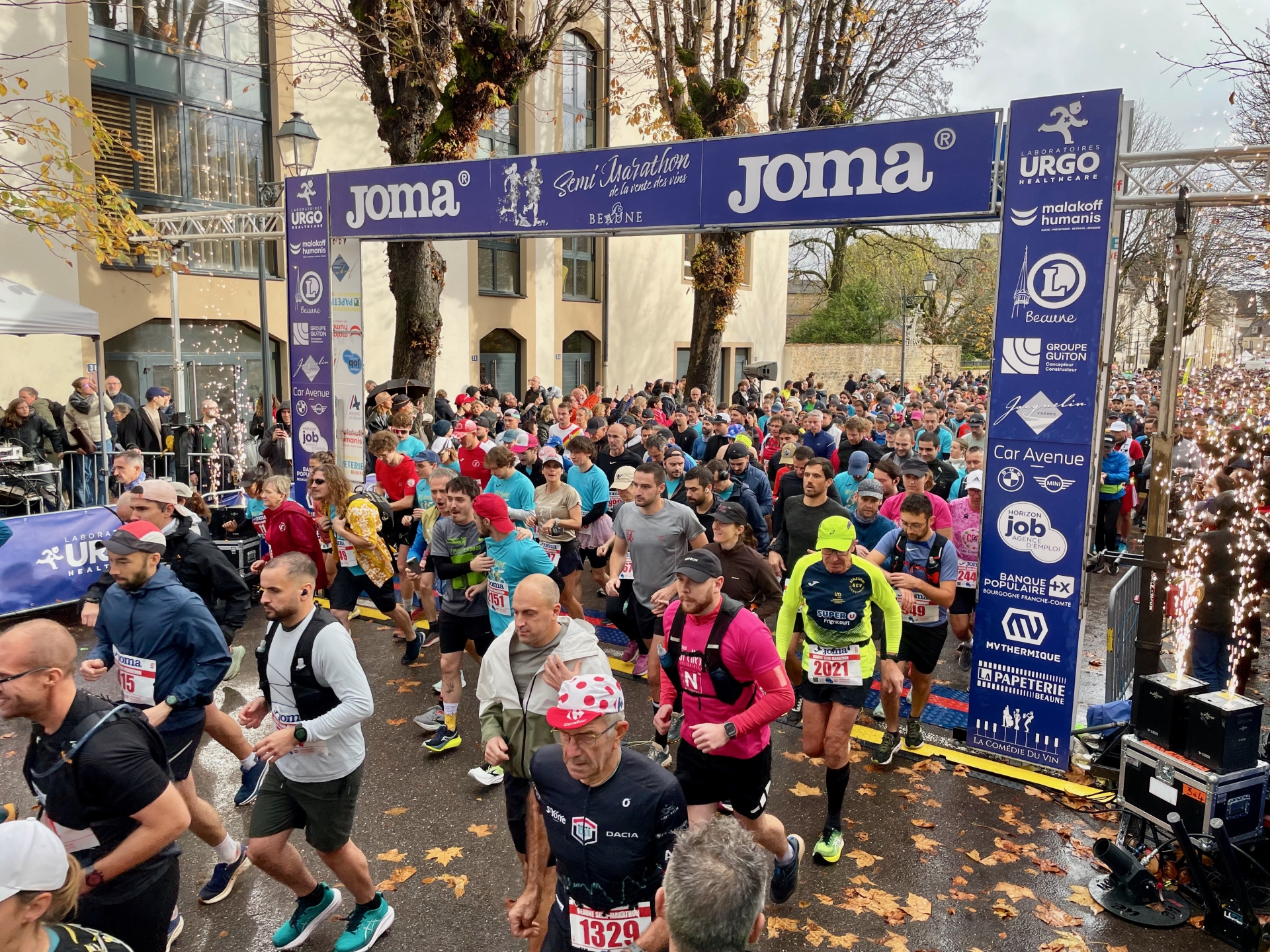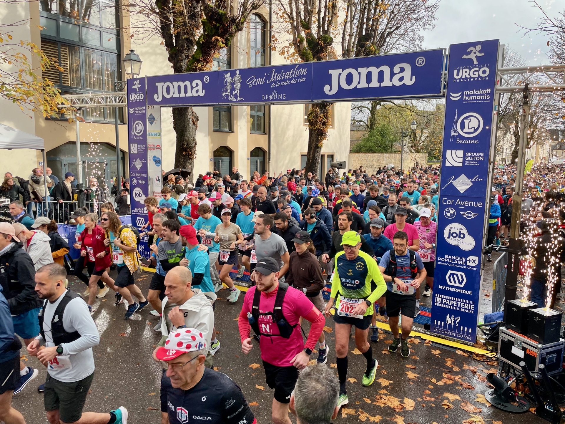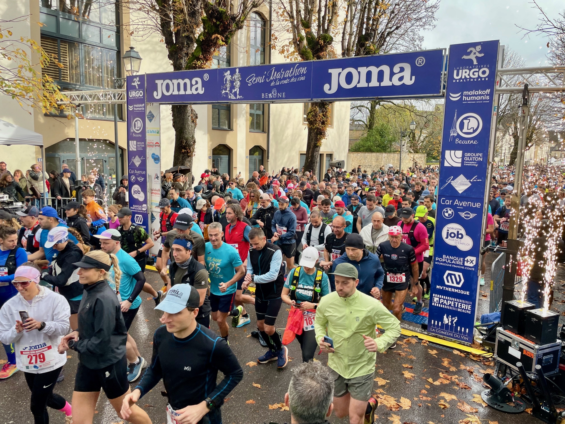 La pluie a cessé à temps : à 14 h, plus de 3 000 coureurs se sont élancés pour le 38ᵉ Semi-Marathon de la Vente des Vins de Beaune, dans une ambiance survoltée entre holà, ban bourguignon et spectacle pyrotechnique.
