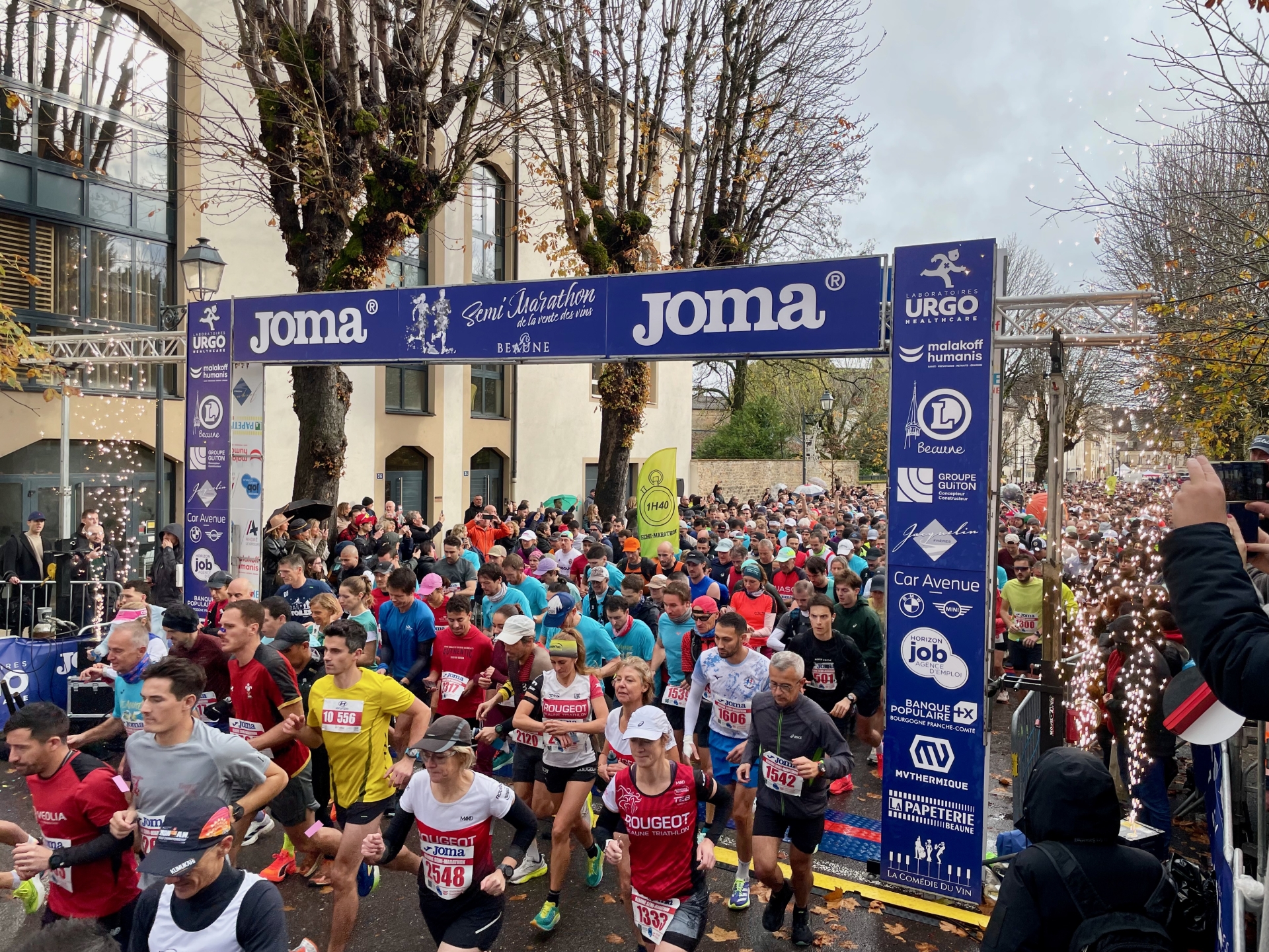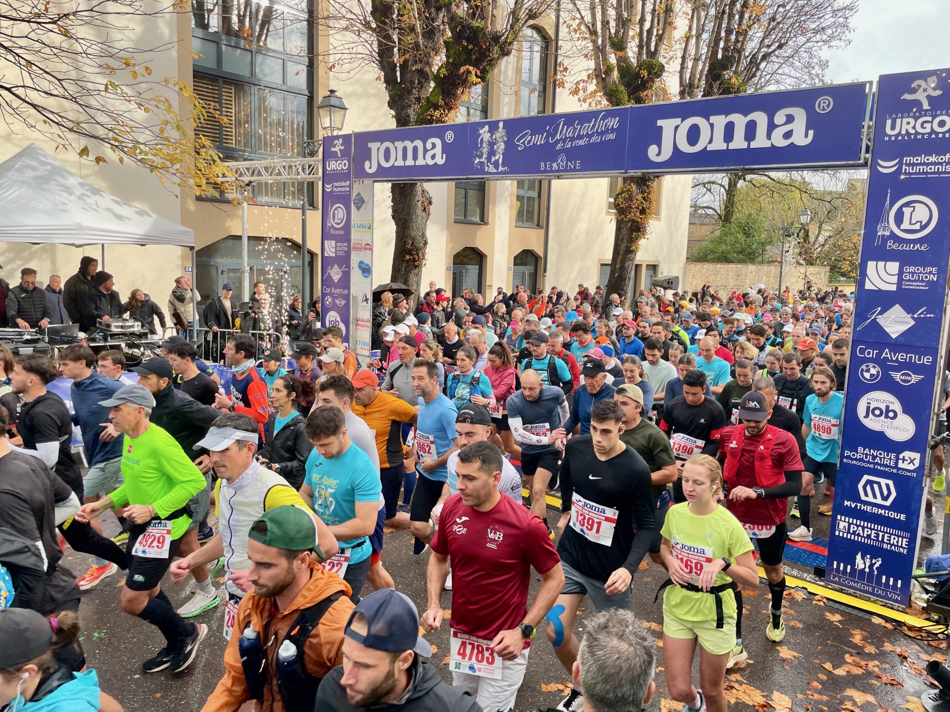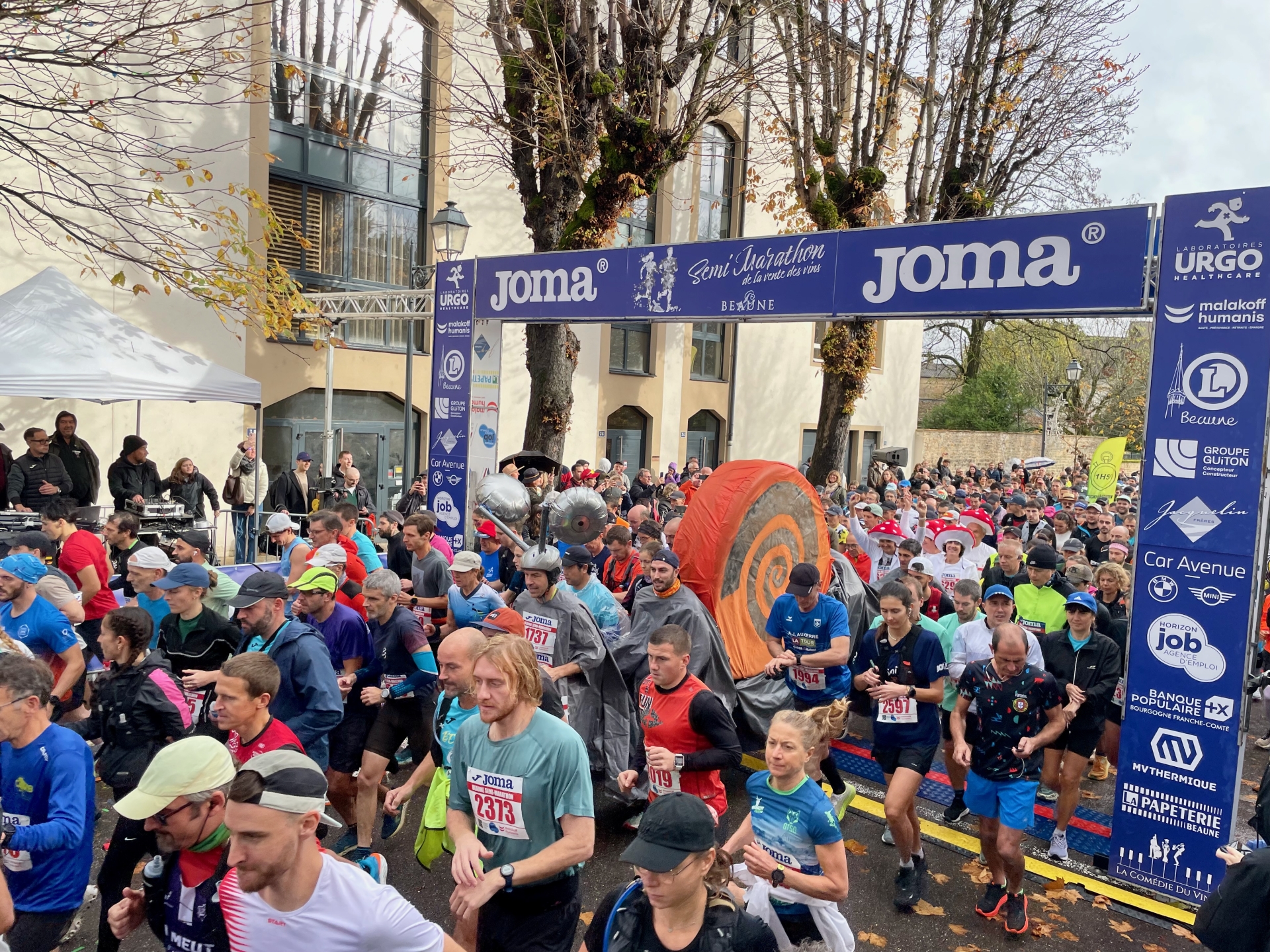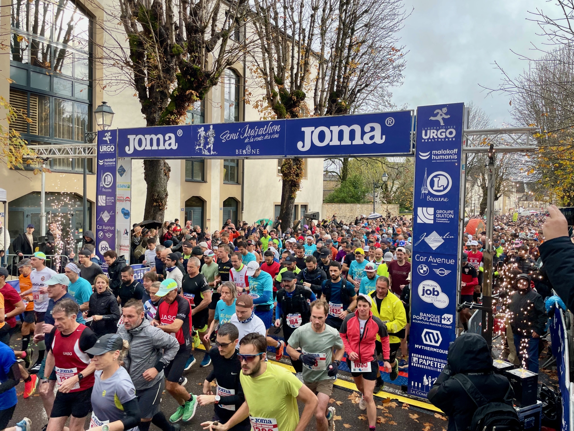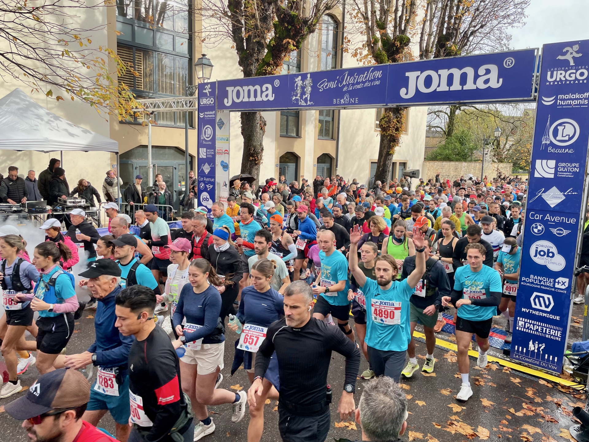 La pluie a cessé à temps : à 14 h, plus de 3 000 coureurs se sont élancés pour le 38ᵉ Semi-Marathon de la Vente des Vins de Beaune, dans une ambiance survoltée entre holà, ban bourguignon et spectacle pyrotechnique.