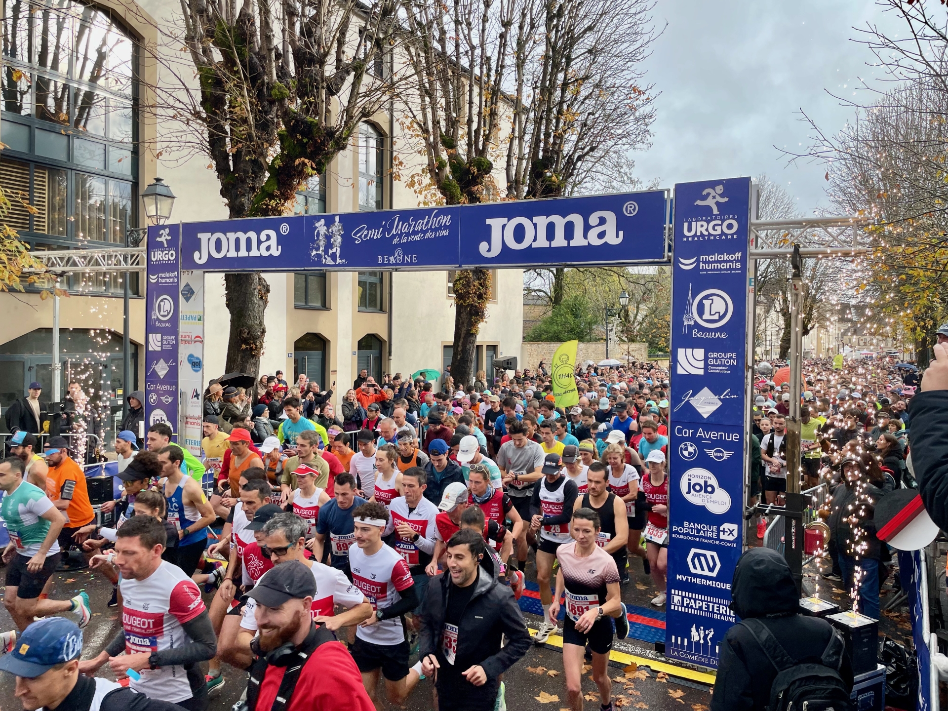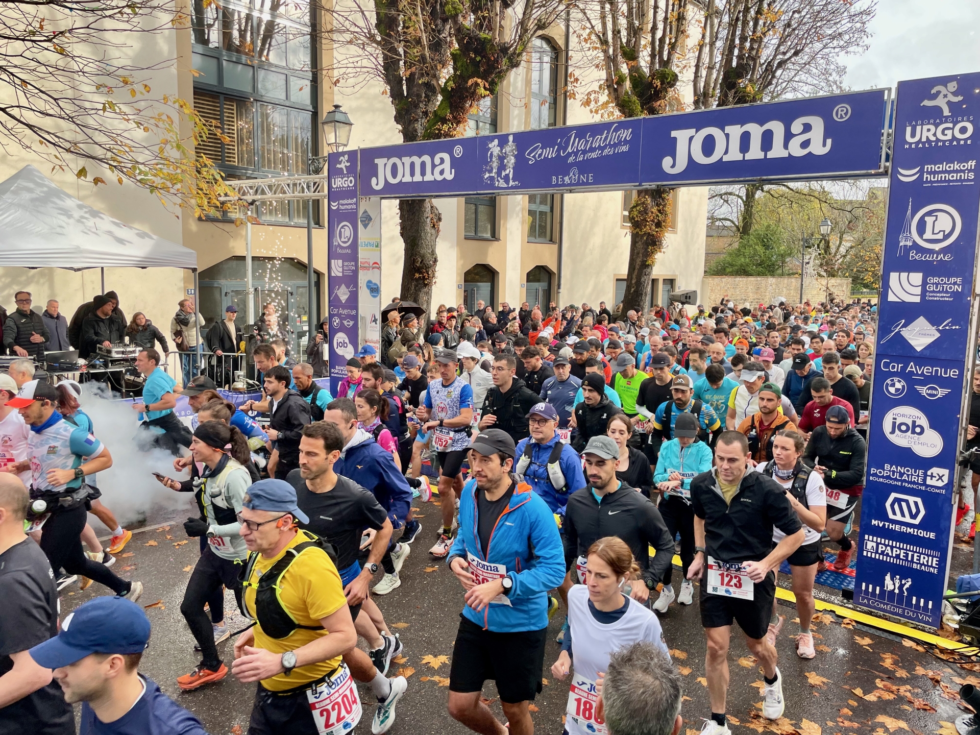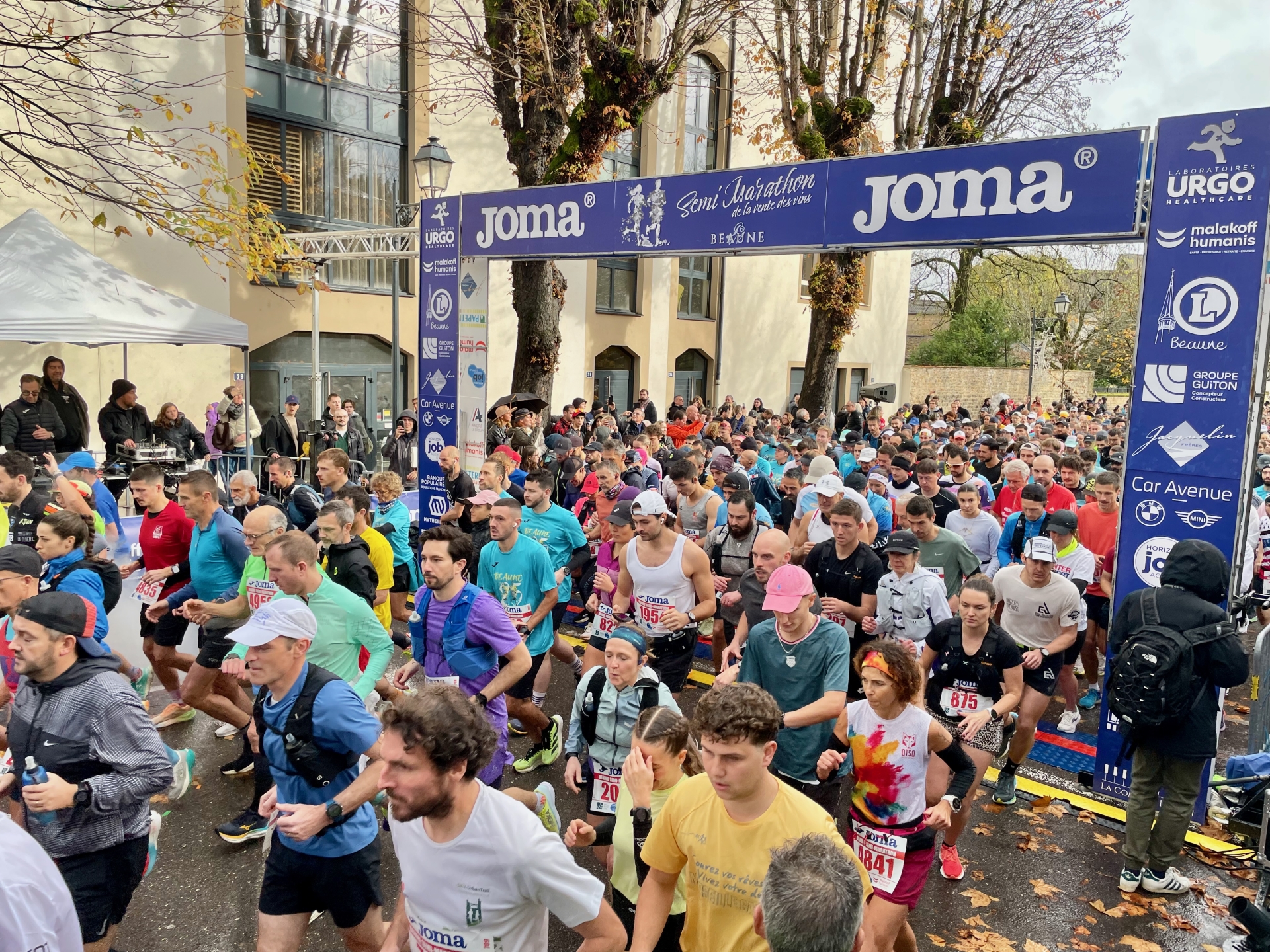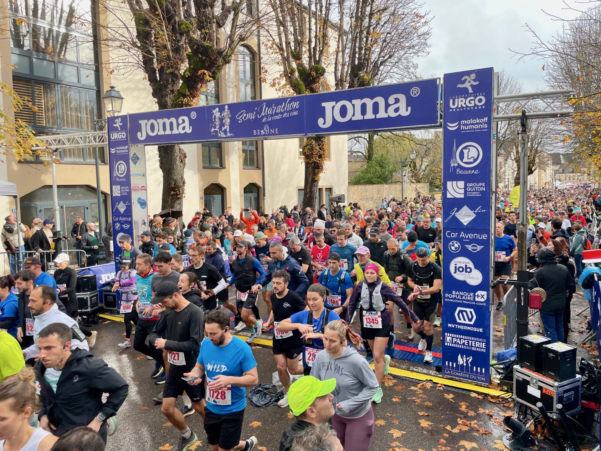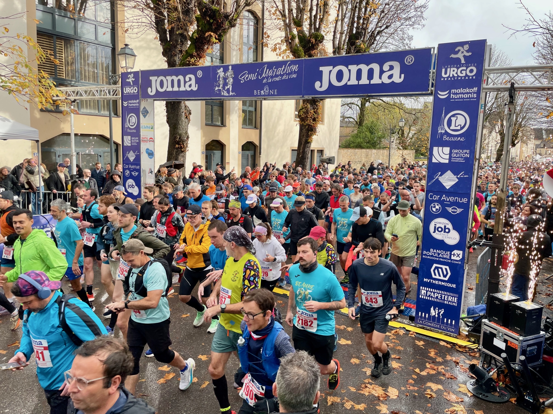 La pluie a cessé à temps : à 14 h, plus de 3 000 coureurs se sont élancés pour le 38ᵉ Semi-Marathon de la Vente des Vins de Beaune, dans une ambiance survoltée entre holà, ban bourguignon et spectacle pyrotechnique.