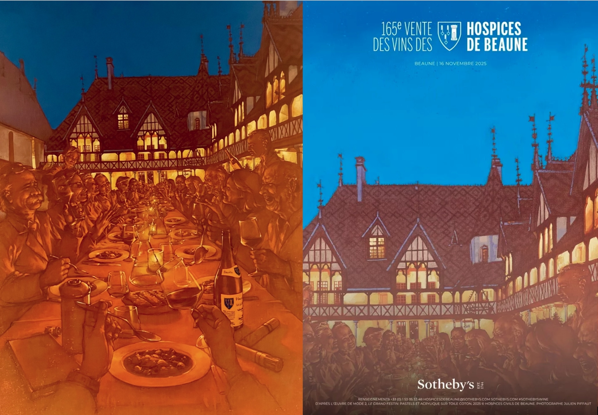 Mais l’une des réalisations les plus attendues de Mode 2 cette année était l’affiche officielle de la 165ᵉ Vente des Vins. dévoilée cet été. La version initiale représentait une grande tablée joyeuse dans la cour des Hospices : personnages souriants, ambiance chaleureuse, bouteilles affichant les couleurs de l’institution — une scène fidèle à l’esprit de la Vente.
