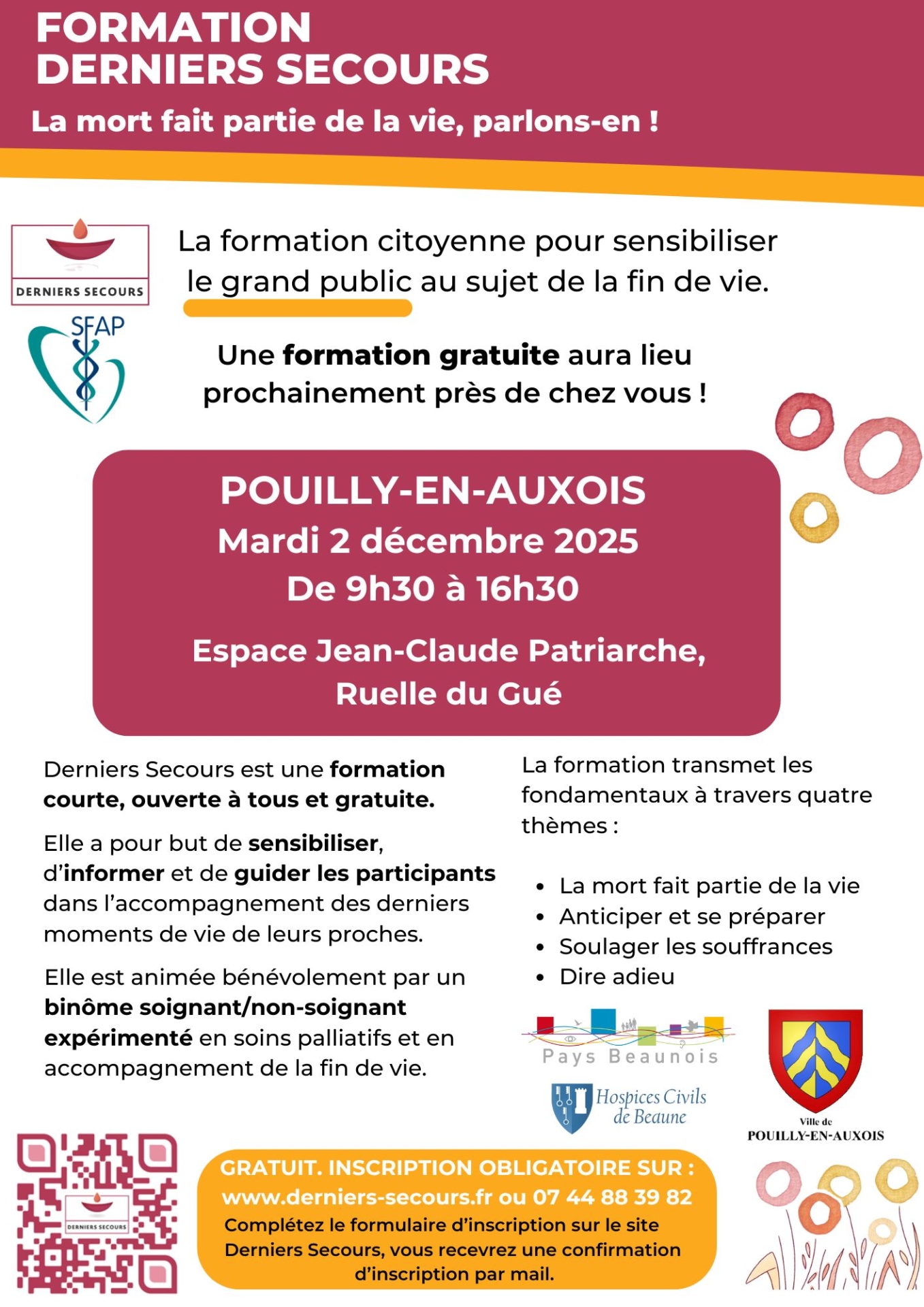 Dans le cadre du Contrat Local de Santé, le Pays Beaunois, l’Équipe Mobile de Soins Palliatifs des Hospices Civils de Beaune et la Société Française d’Accompagnement et de Soins Palliatifs (SFAP) organisent une journée de sensibilisation “Dernier Secours”, le mardi 2 décembre, de 9 h 30 à 16 h 30, à Pouilly-en-Auxois (Espace Jean-Claude Patriarche, Ruelle du Gué).