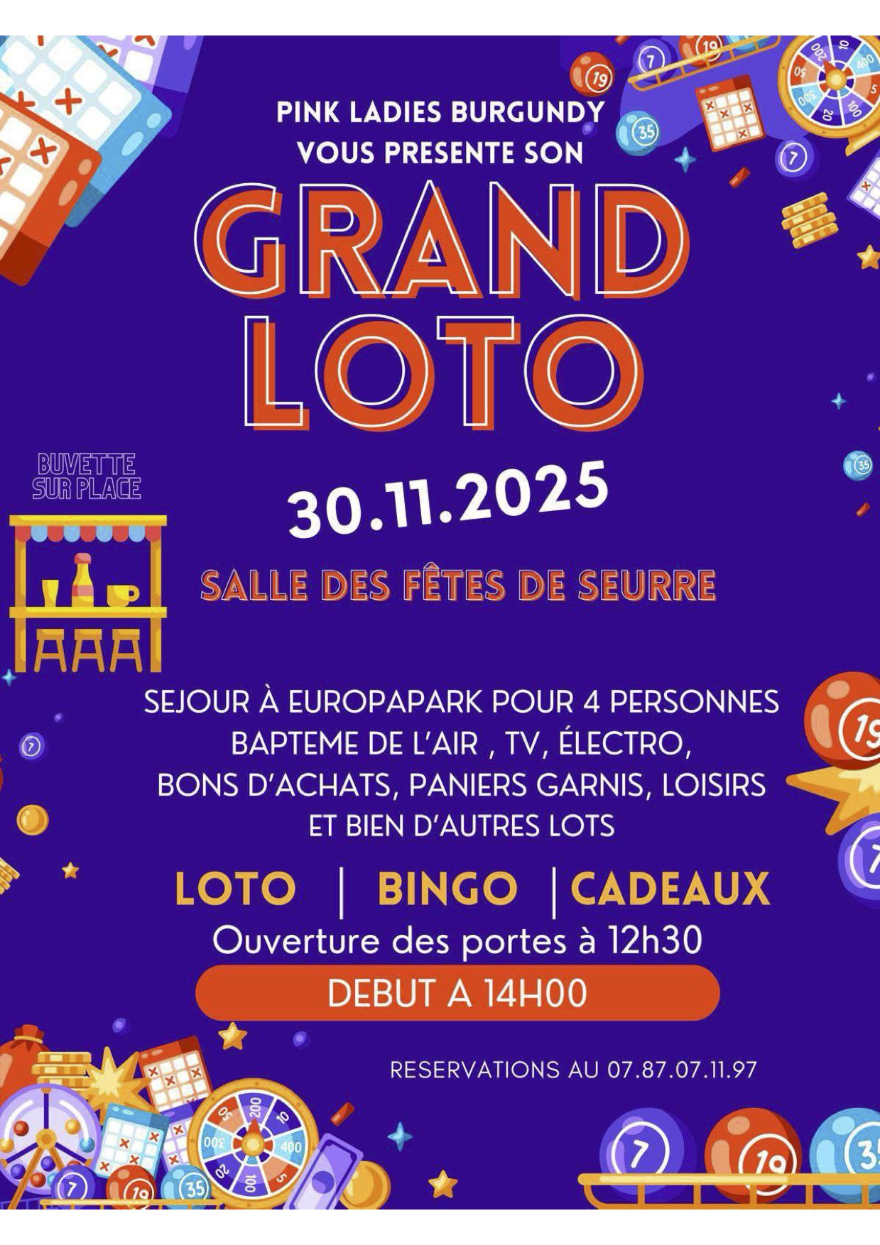 L’association Pink Ladies Burgundy organise un loto le dimanche 30 novembre, à la salle des fêtes de Seurre. Les portes ouvriront à 12 h 30 et le loto débutera à 14 h.
