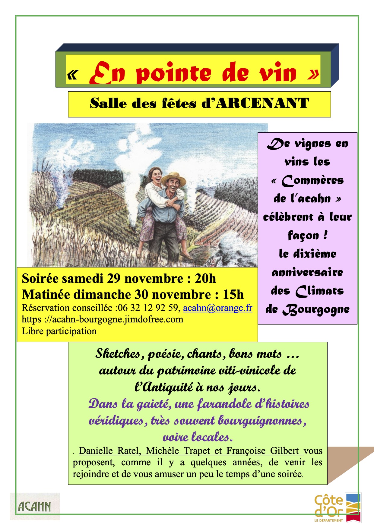 "Les Commères" de l'ACAHN est une Association Culturelle et Archéologique des Hautes-Côtes de Nuits qui travaille depuis maintenant une cinquantaine d'années à la mise en valeur du patrimoine de Côte d'Or et particulièrement celui de la Côte et des Hautes-Côtes de Dijon à Beaune : visites guidées, recherches, expositions, publications, conférences-spectacles, activités à la demande ....