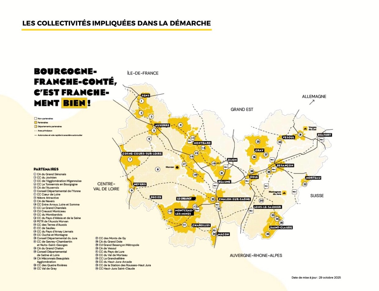 L'expérimentation qui comptait 34 collectivités à son démarrage, est aujourd'hui rejointe par le département du Jura, ce qui porte le nombre de territoires partenaires à 35 collectivités, dont quatre départements (Yonne, Nièvre, Saône-et-Loire et Jura) et 31 intercommunalités. L'arrivée du Jura illustre la volonté régionale d'élargir le dispositif.