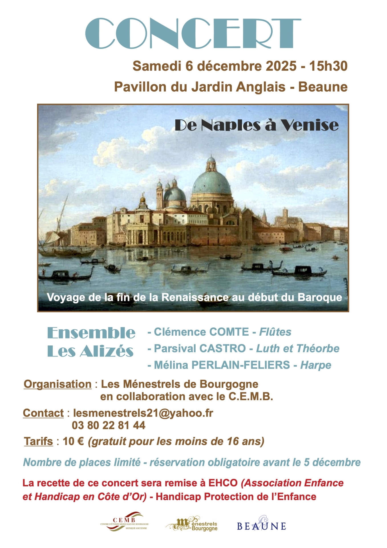 La recette du concert sera intégralement reversée à l’association EHCO – Enfance et Handicap en Côte-d’Or, engagée dans la protection de l’enfance et l’accompagnement du handicap.