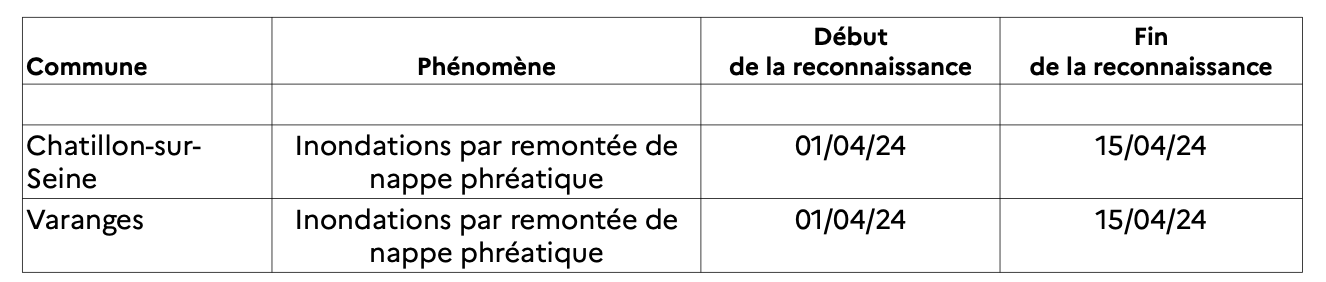 À noter que l’état de catastrophe naturelle n’est pas reconnu pour la commune de Bessey-lès-Cîteaux (inondations par remontée de nappe phréatique du 7 au 8 octobre 2024)