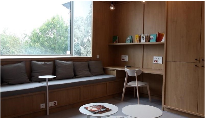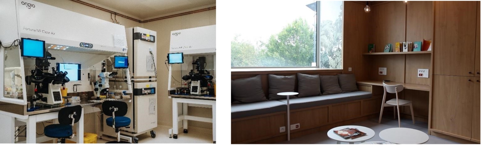 Installé à l’entrée de la maternité, l’Institut de la Fertilité se distingue immédiatement par son architecture : une résille métallique blanche représentant des arbres fruitiers enveloppe le bâtiment, symbole de fertilité et de renaissance. À l’intérieur, le bois, la lumière douce, l’absence de couloirs rectilignes et les espaces cosy rompent totalement avec l’image habituelle d’un service hospitalier.