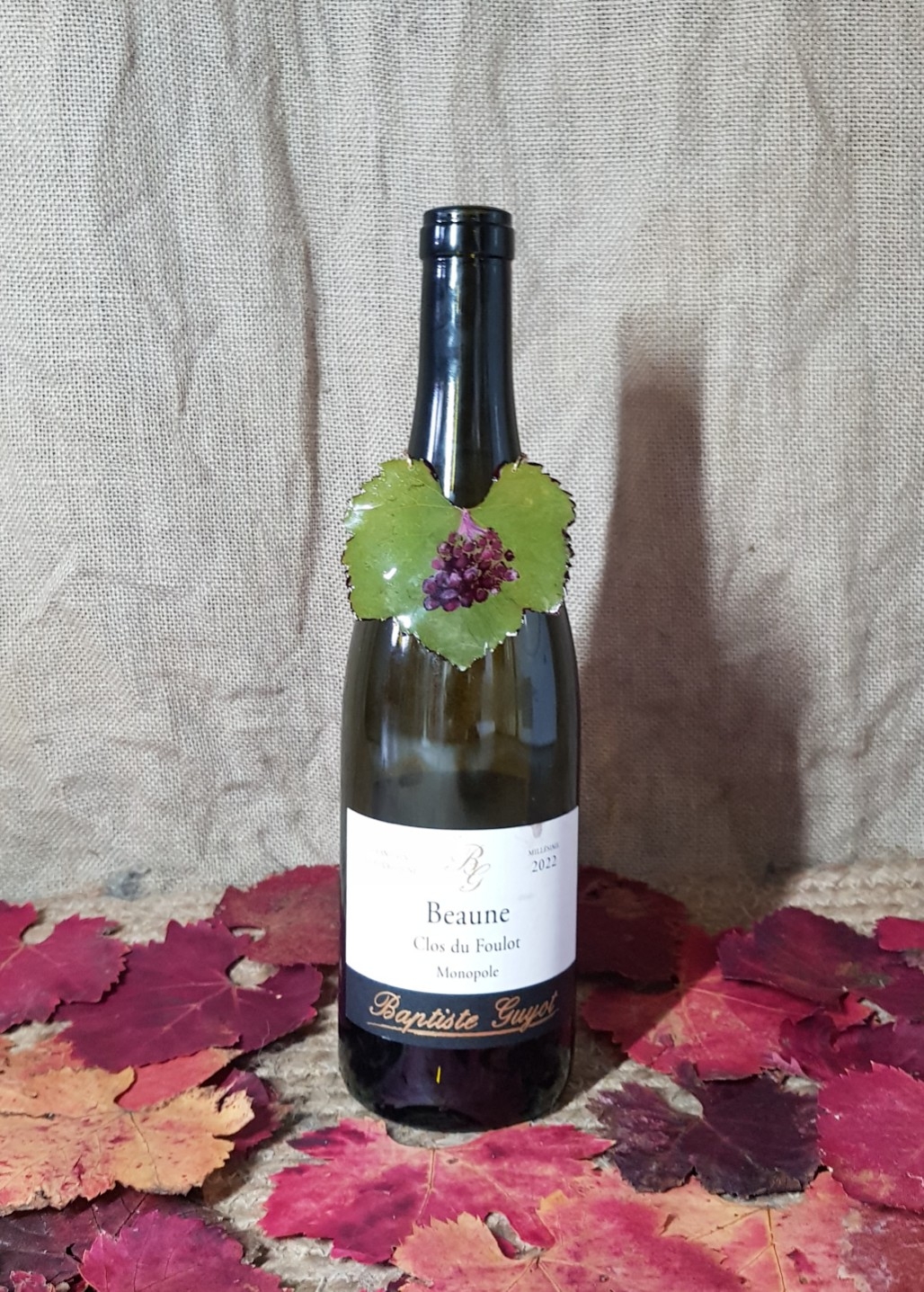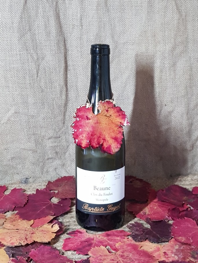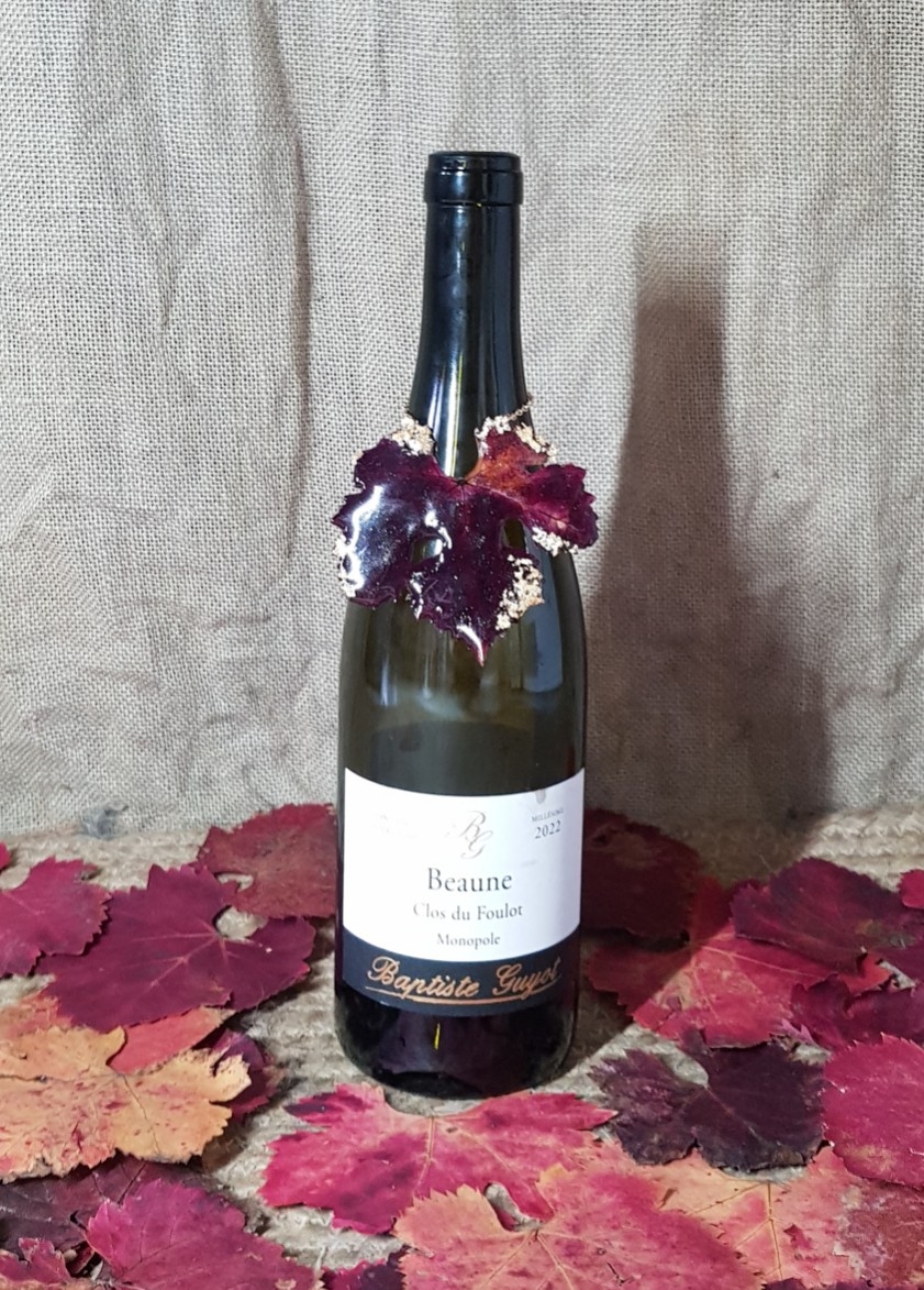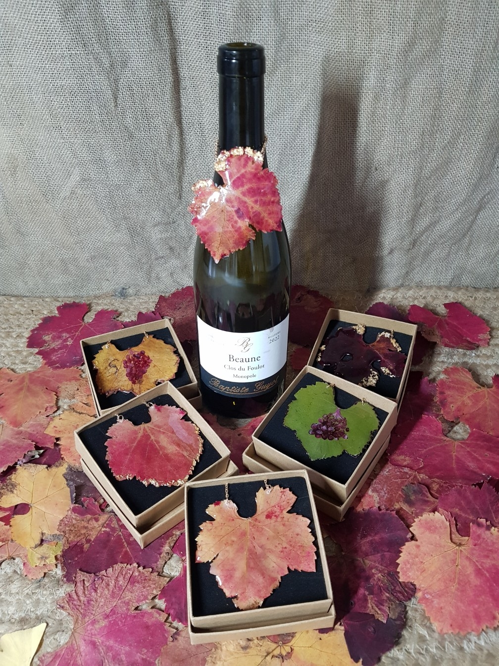utiliser les feuilles de vigne pour créer des bijoux… de bouteille. « En Bourgogne, les vignes donnent un vin magnifique. Pourquoi ne pas rendre hommage au travail des vignerons ? Une bouteille offerte raconte déjà une histoire… un bijou peut la prolonger. »