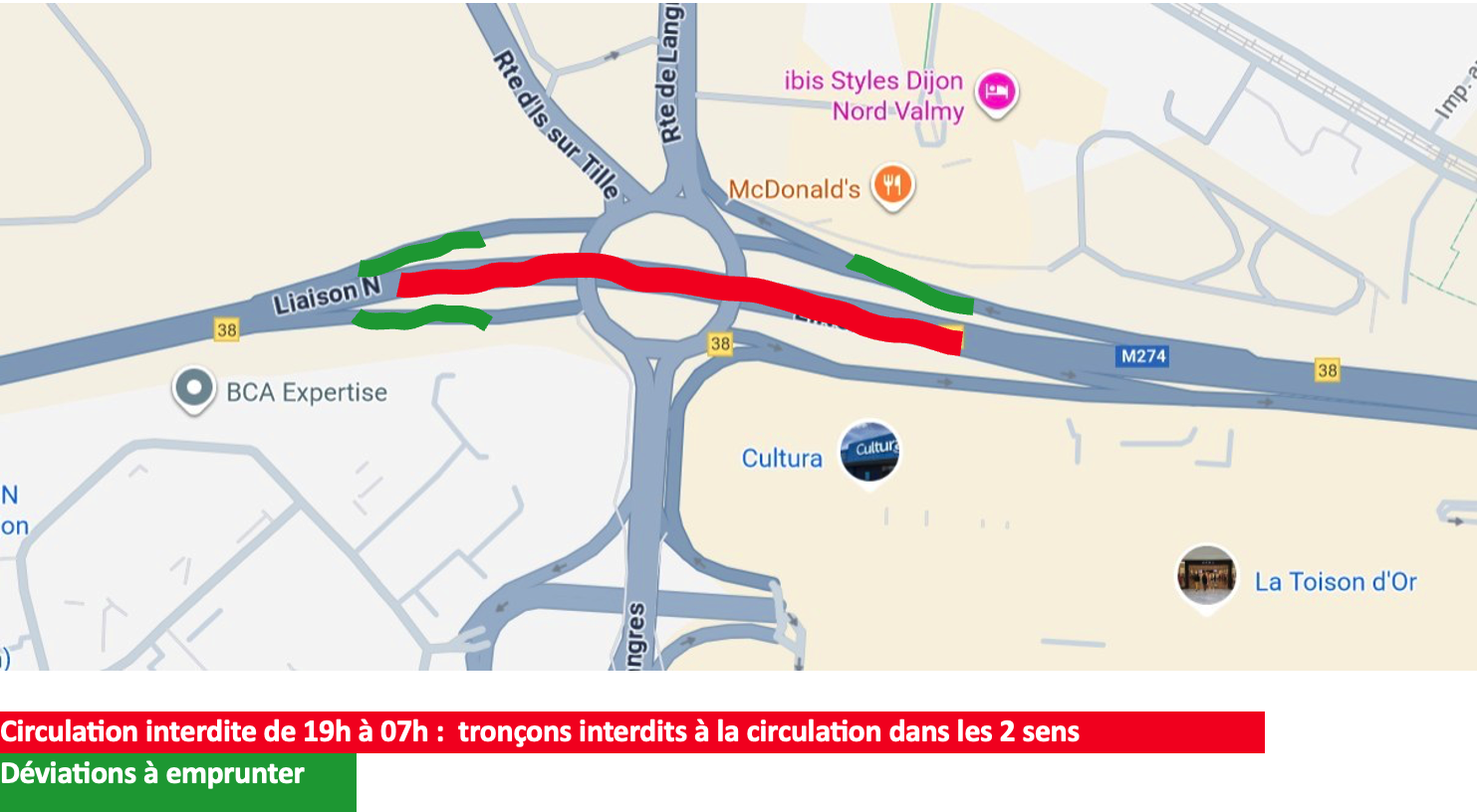 • sur la RD 974 dans le sens Langres – Dijon depuis le giratoire avec la RD 959, commune de Til-Chatel, jusqu’au giratoire avenue de Langres / M974 / M274