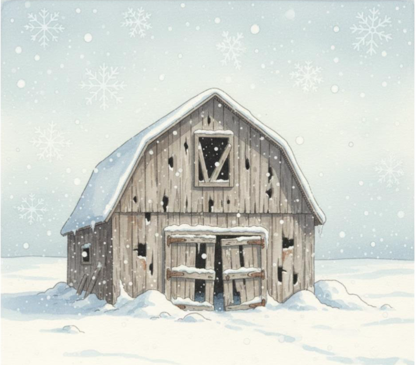 Il était une fois une grange toute cabossée, lézardée par endroit, dehors le paysage était givré d’une douce blancheur, c’était un vrai déferlement de neige.