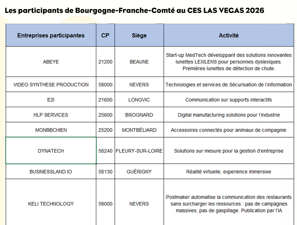 « La présence de la Bourgogne-Franche-Comté au CES Las Vegas illustre notre ambition : offrir aux entreprises régionales un tremplin vers les marchés mondiaux. Grâce à l’engagement du Conseil régional, à l’expertise de l’Agence Économique Régionale et au soutien de la CCI Bourgogne-Franche-Comté, nous créons les conditions pour attirer des investisseurs, développer des partenariats et renforcer l’attractivité de notre territoire. Notre région, labellisée Capitale French Tech, démontre qu’elle est un acteur majeur de l’innovation et de la compétitivité à l’international. » Patrick Molinoz, vice-président de la Région Bourgogne-Franche- Comté.