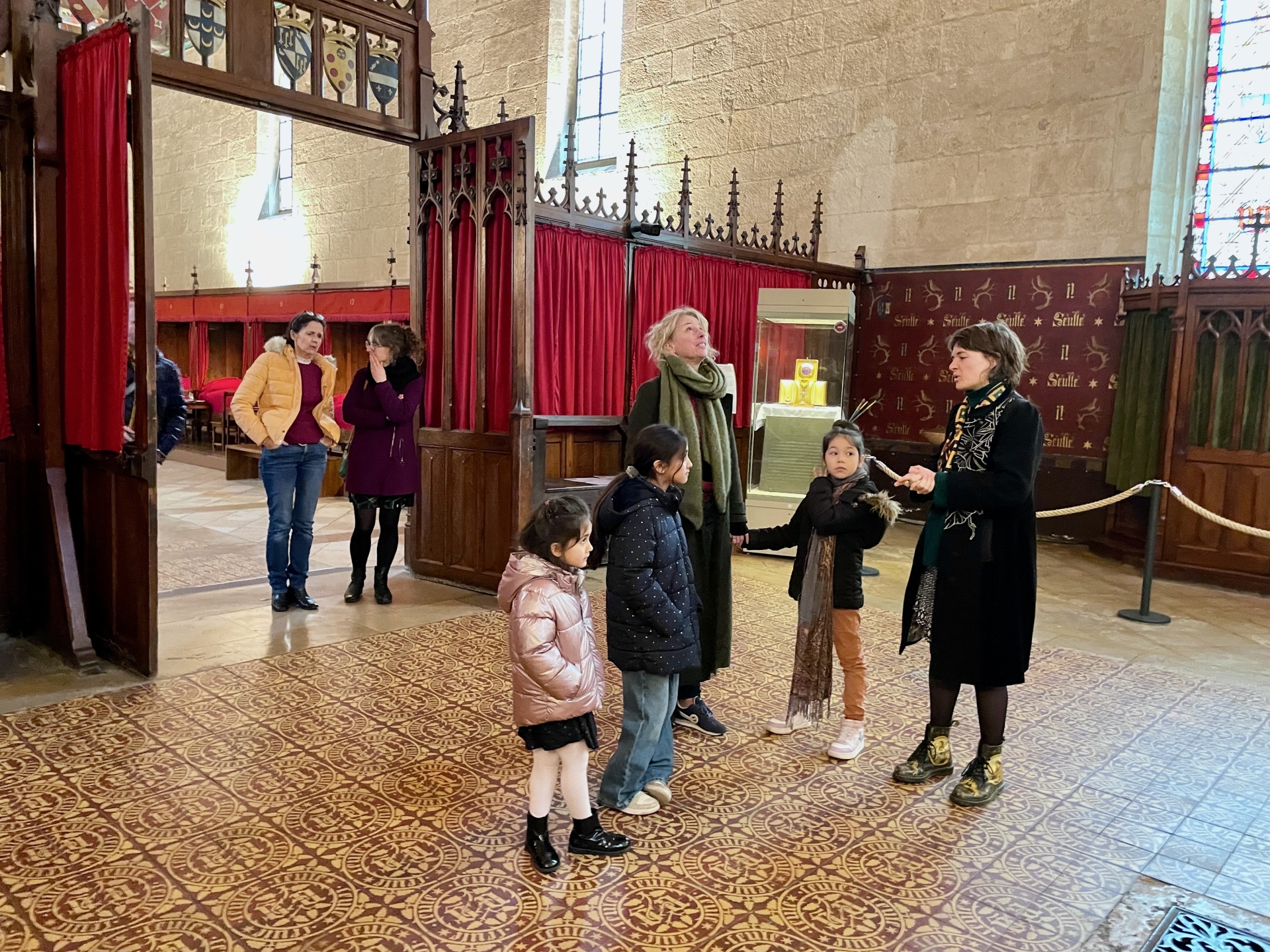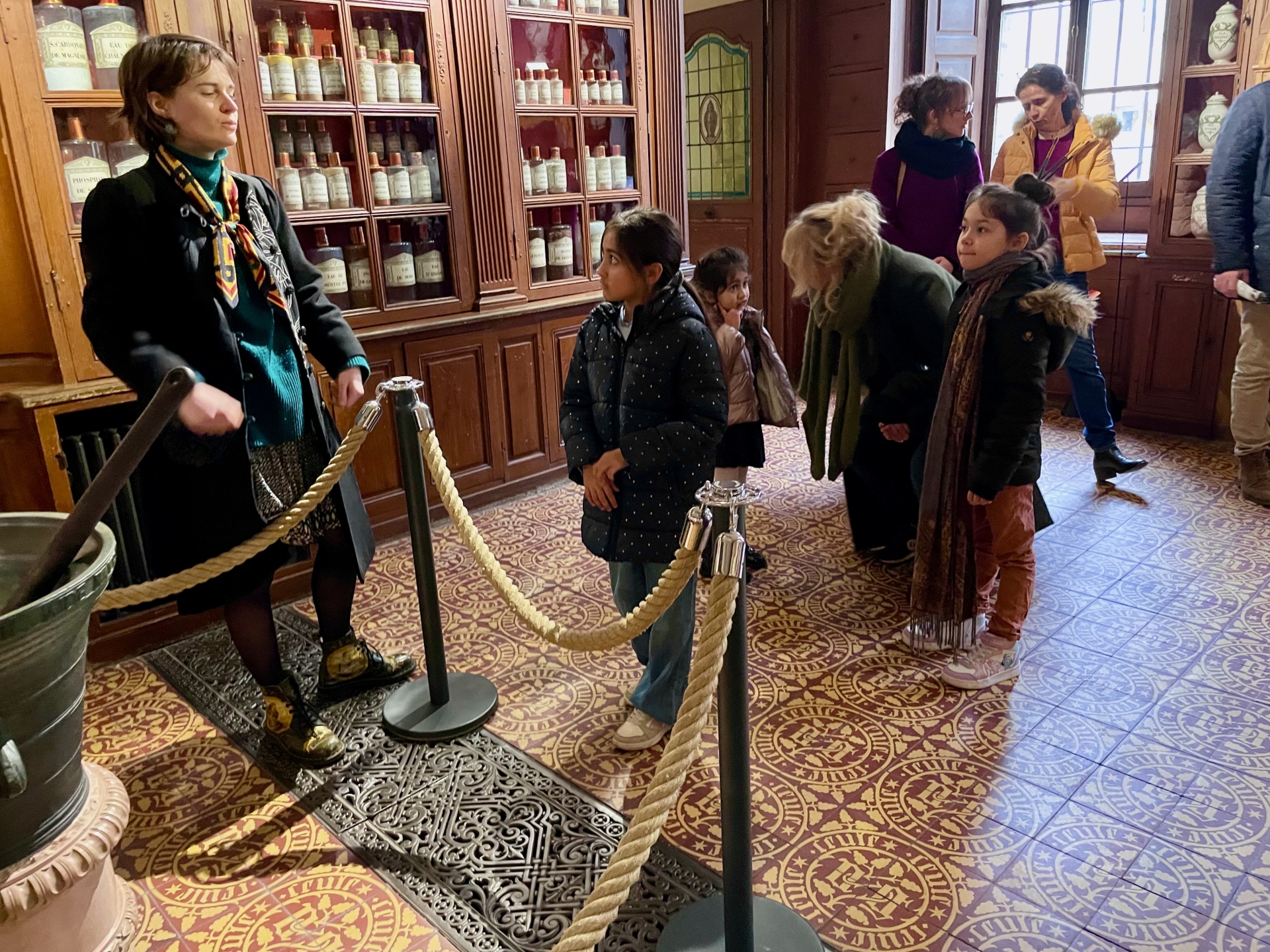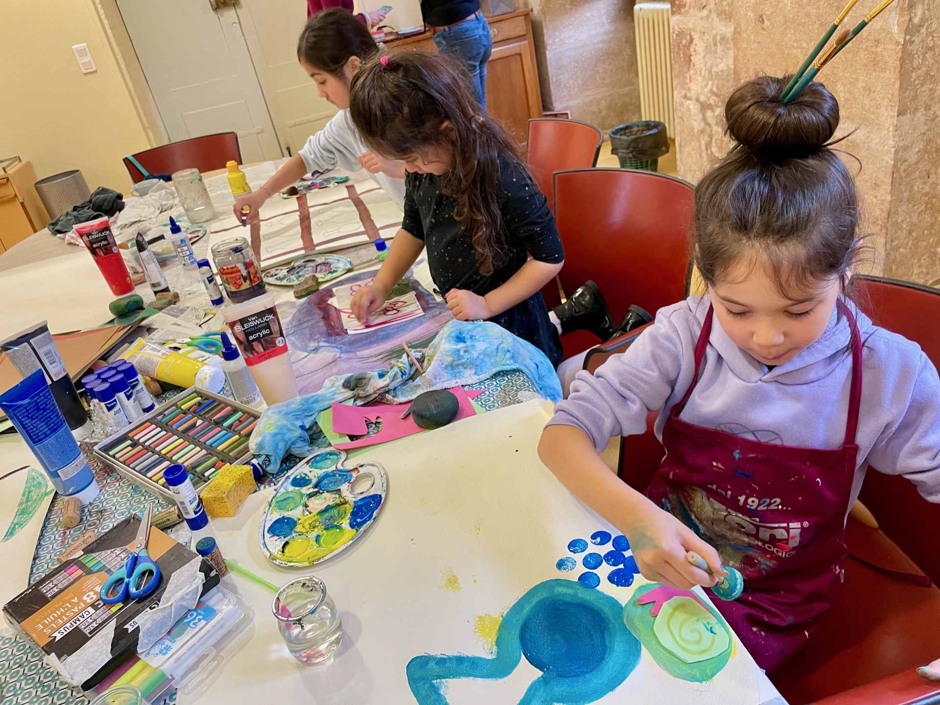 Ce mercredi matin, la séance se tenait dans un lieu chargé d’histoire en termes de soin : l’Hôtel-Dieu de Beaune. Animée par Stéphanie Mutin, art-thérapeute à Beaune, elle a accueilli un petit groupe d’enfants. D’ordinaire, les séances ont lieu dans son cabinet, mais le cadre hospitalier prend ici tout son sens. Avant de créer, les enfants ont participé à une visite guidée menée par Chloé, guide-conférencière. Salle des Pôvres, ancienne pharmacie, vocation fondatrice du site : celle d’un hôpital pensé pour soigner les plus démunis. Un choix loin d’être anodin, autant de repères qui donnent du sens à la démarche. Puis vient le temps de la création.
