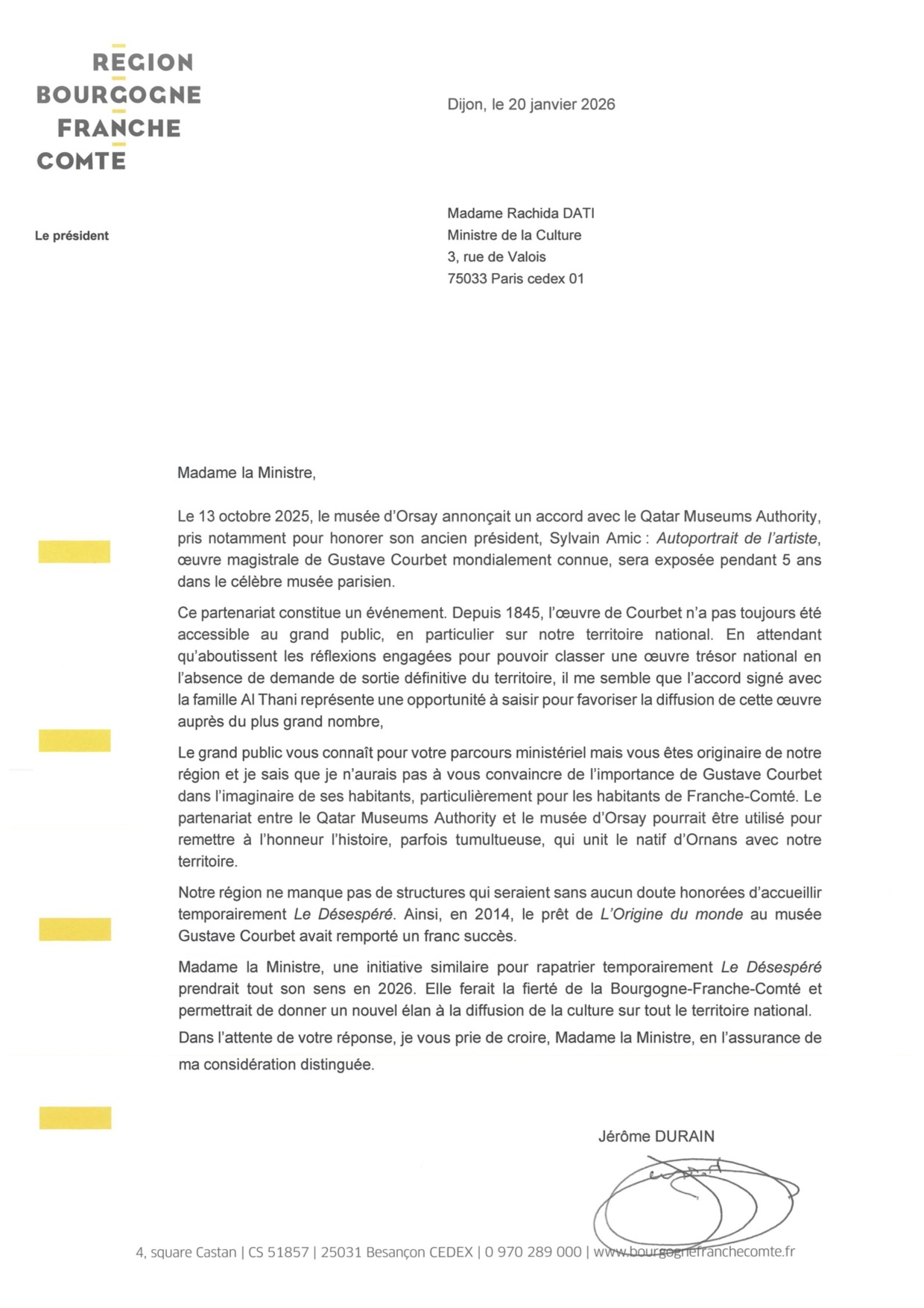 Le 20 janvier dernier, Jérôme Durain, président de la Région Bourgogne-Franche-Comté, a adressé un courrier à la ministre de la Culture, Rachida Dati. Il l'appelle à favoriser le rapatriement en Bourgogne-Franche-Comté, de l'œuvre magistrale de Gustave Courbet : Autoportrait de l'artiste (dit Le Désespéré*). Gustave Courbet est né en 1819 à Ornans (Doubs), au cœur de la Franche-Comté. Le tableau appartient à un collectionneur privé et est prêté dans le cadre d’accords d’exposition temporaires.