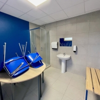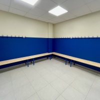 D’une superficie totale de 135 m², l’équipement comprend : un vestiaire joueurs visiteurs, un vestiaire joueurs du club, identifiable par sa couleur bleue, symbole de l’AS Beaune et de la Ville, deux vestiaires arbitres, un WC public PMR, une infirmerie et un local technique situé à l’arrière du bâtiment. Tous les vestiaires sont équipés de douches et de sanitaires.