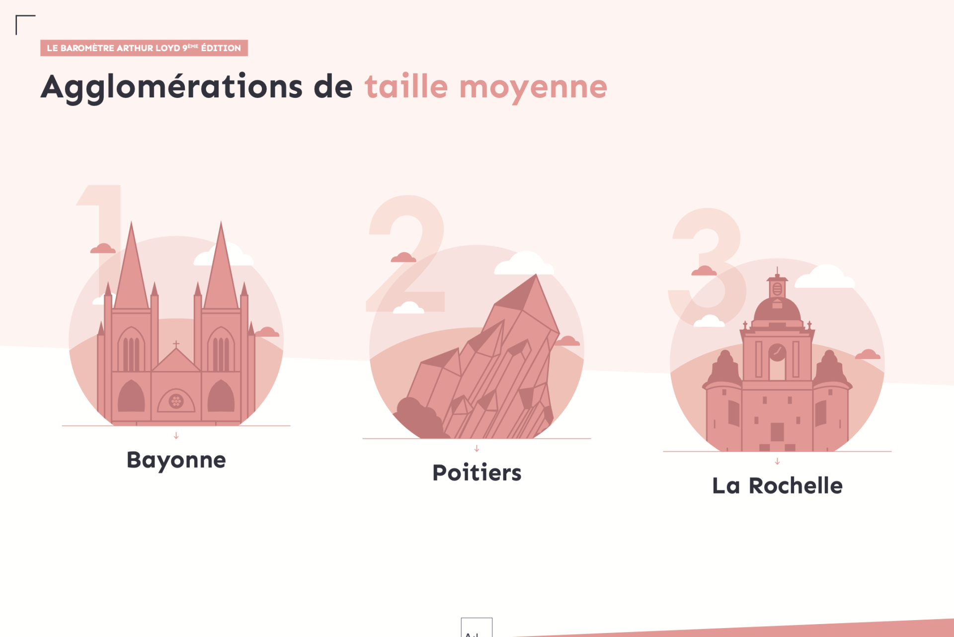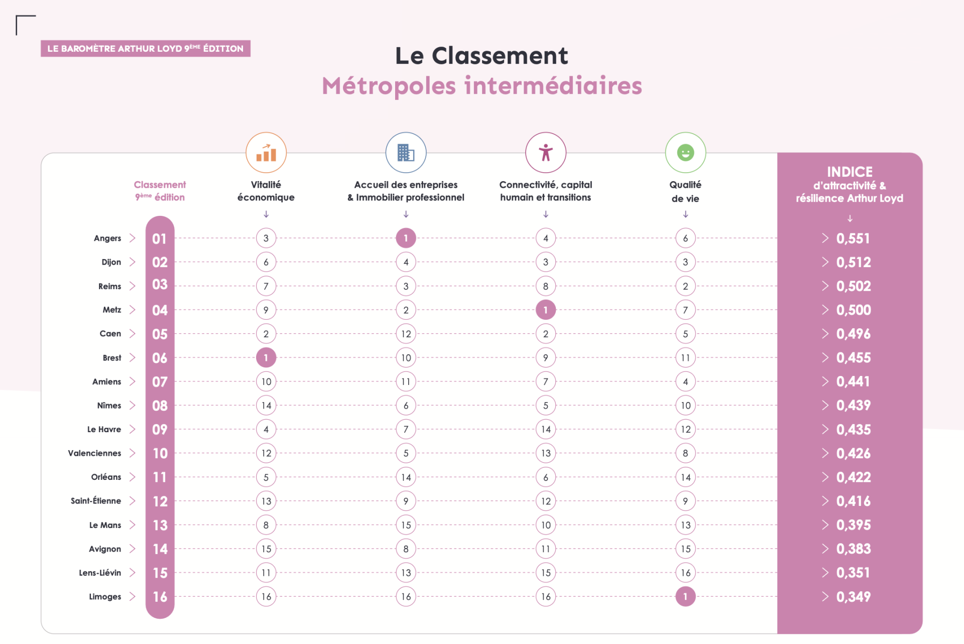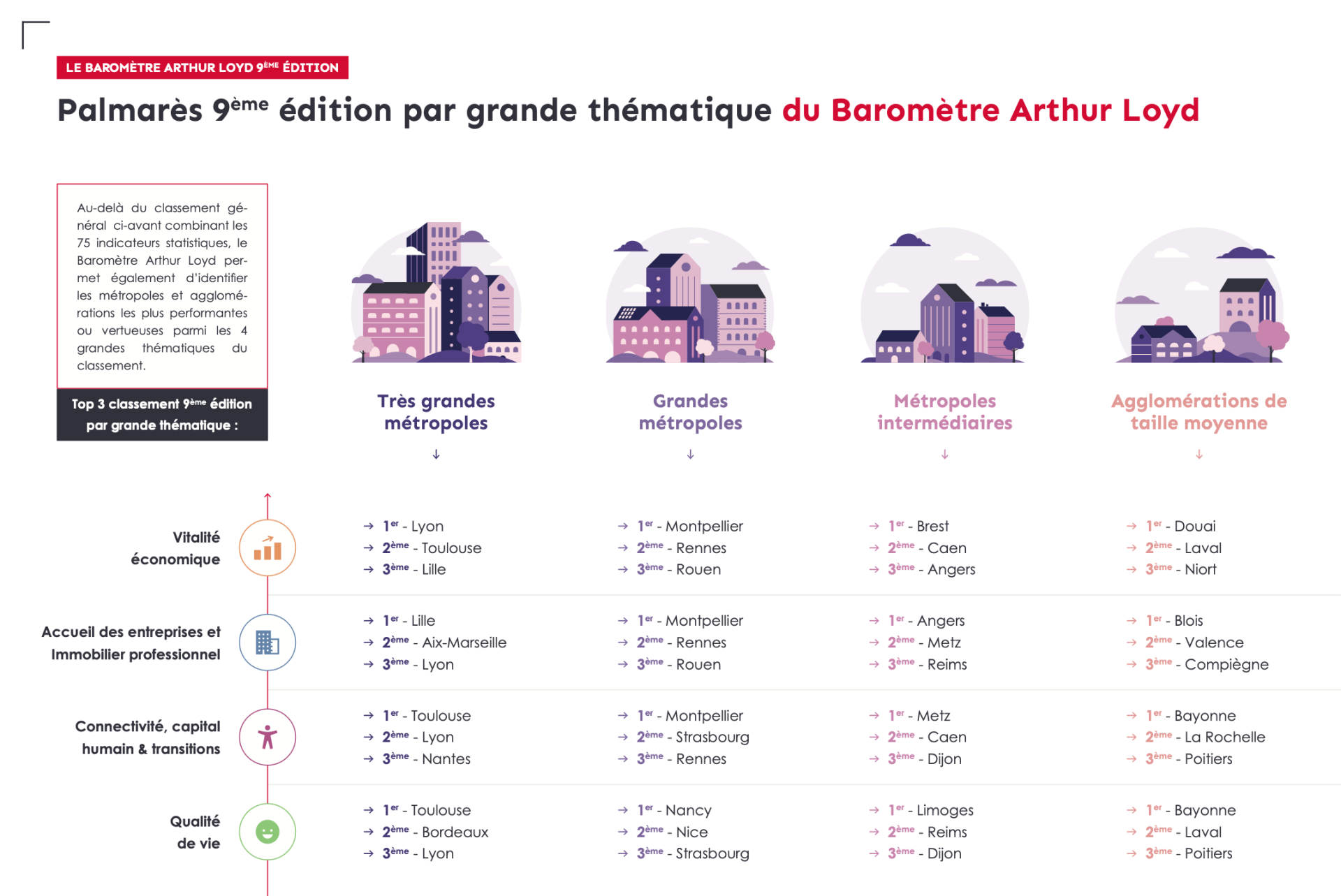 Le Baromètre Arthur Loyd repose sur : 75 indicateurs, 4 grands thèmes : vitalité économique, immobilier d’entreprise, capital humain et connectivité, qualité de vie, 50 villes françaises, 4 catégories de taille.