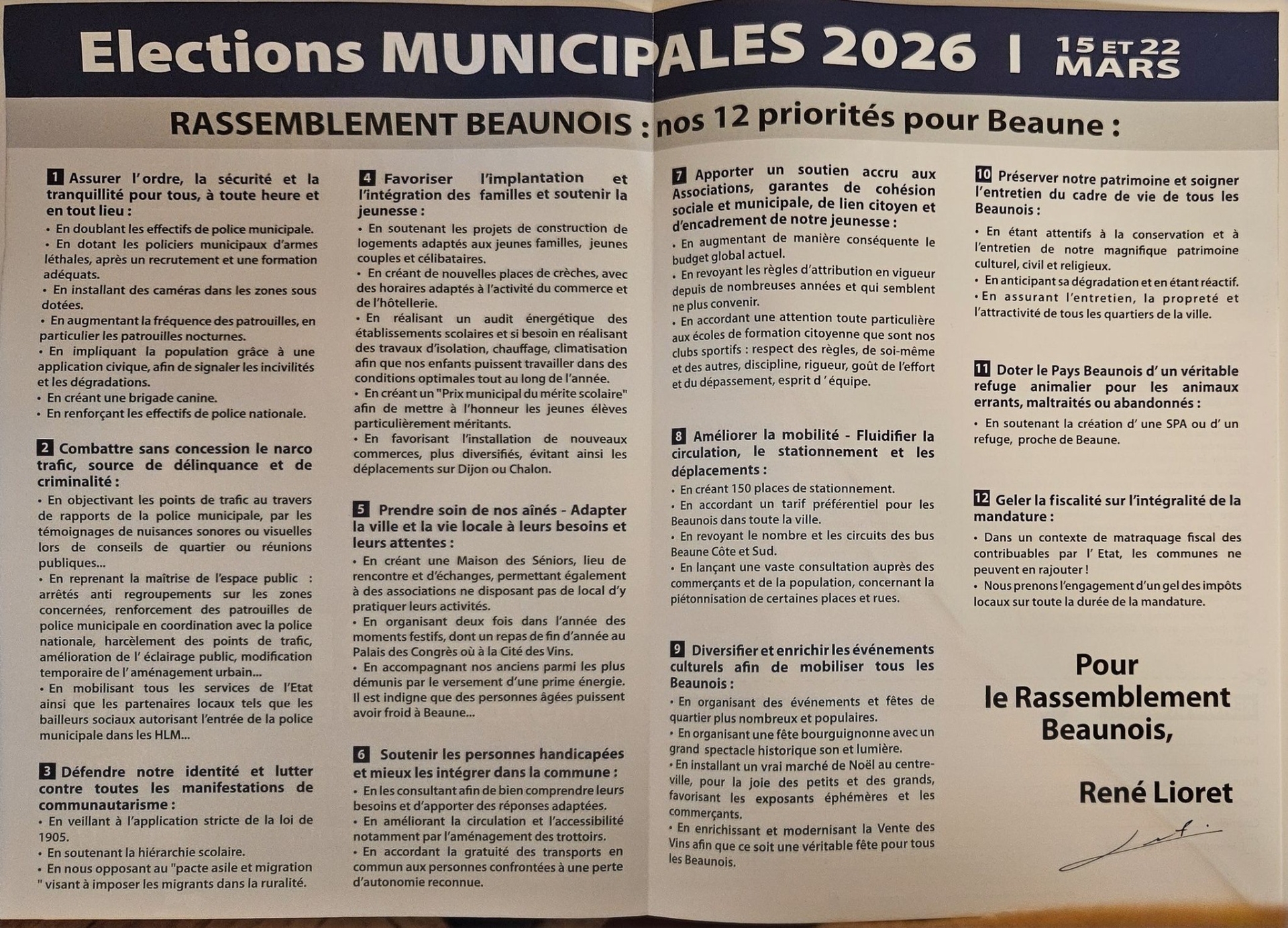 À l’approche des élections municipales des 15 et 22 mars 2026, René Lioret, député et tête de liste du Rassemblement Beaunois, diffuse largement son programme auprès des habitants. Sécurité, lutte contre le narcotrafic, soutien aux familles, aux associations et gel de la fiscalité figurent parmi les axes majeurs de son projet pour Beaune.