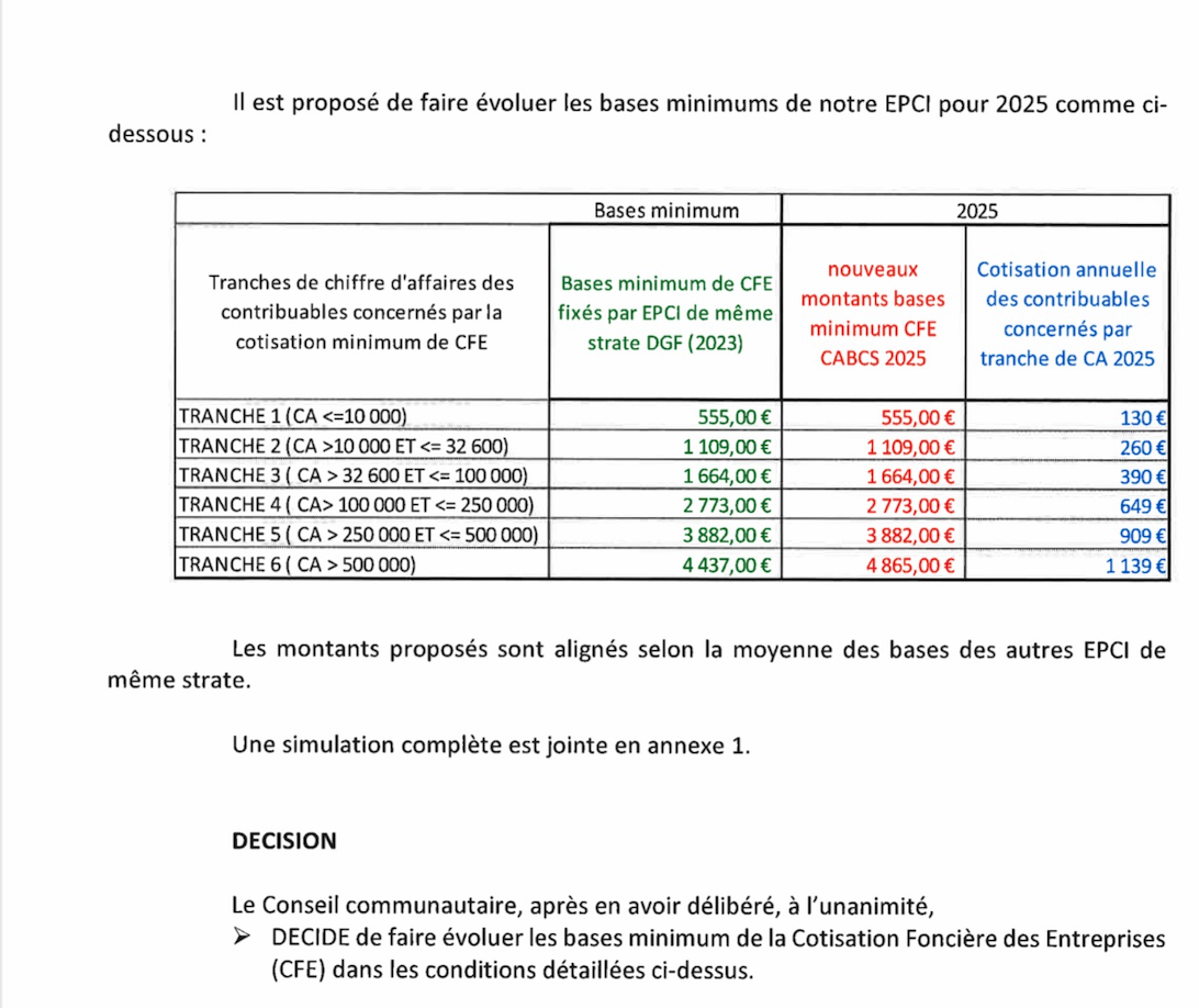 Jusqu’en 2024, la CFE était principalement calculée sur la valeur locative, avec une cotisation minimale relativement faible et uniforme quel que soit le chiffre d’affaires (jusqu’à 500 000 €). Depuis une délibération votée le 23 septembre 2024, la CABCS a instauré des tranches de chiffre d’affaires, chacune associée à une base minimale différente. Ce sont les élus communautaires, et non l’État, qui ont fixé ces bases dans le cadre légal prévu par la loi. « L’État fixe un cadre avec un minimum et un maximum. Mais le choix du montant exact appartient à l’agglomération », confirment les services fiscaux.