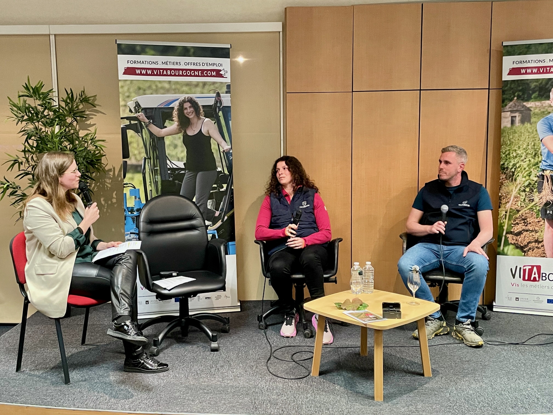 Moment fort de la soirée : les témoignages des égéries VITA Bourgogne, avec Jade Deloge, tractoriste, et Julien Palys, chef de culture. « On trouve facilement sa place dans les métiers de la vigne et du vin, il y a tellement de métiers », témoigne Jade.