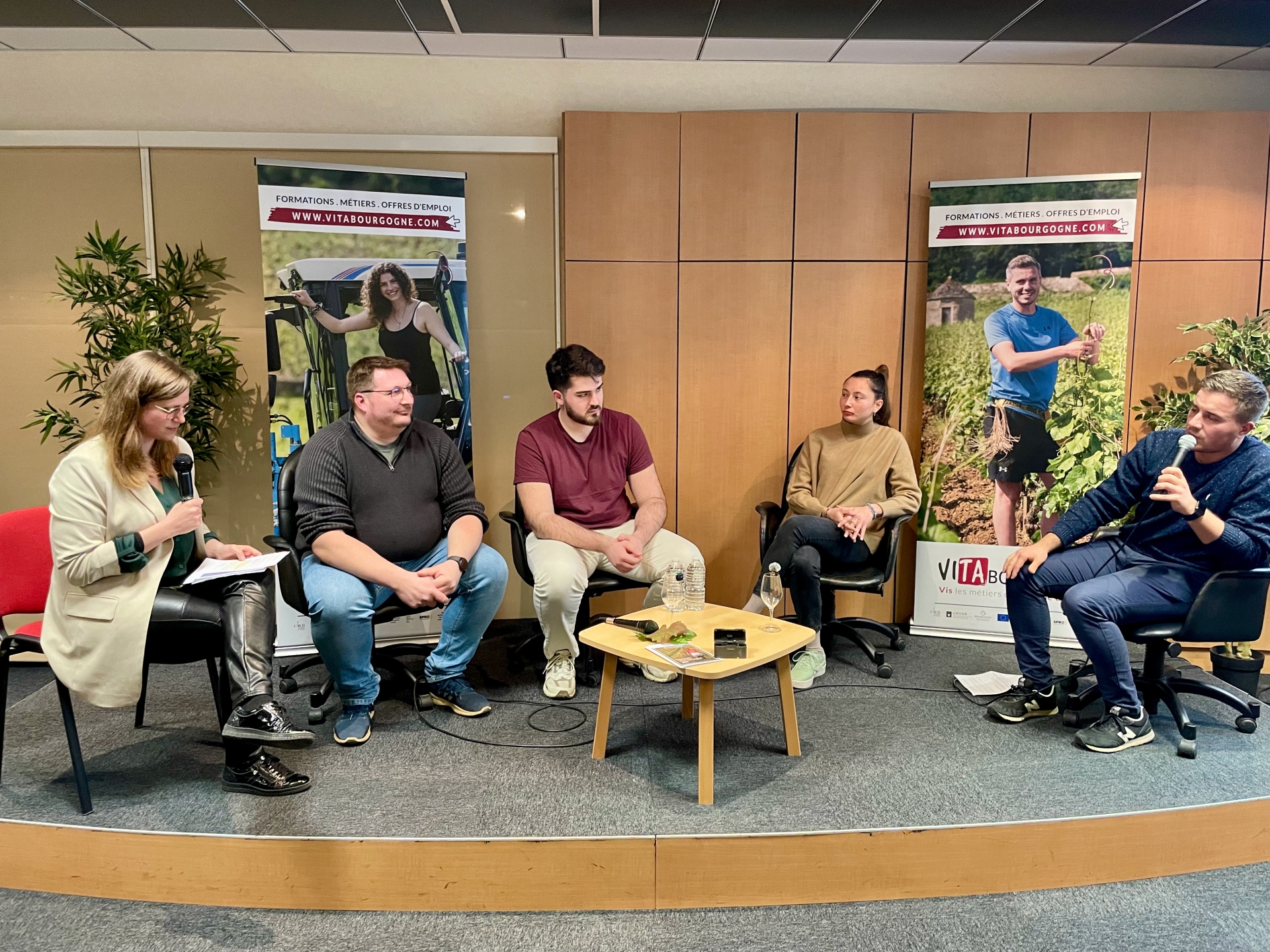 La table ronde intitulée « Pourquoi choisir la vigne et le chai quand on a 15 ans en 2025 ? » a permis de croiser les regards de Guillaume Bouché (EPLEFPA Beaune – Viti Agro Campus), du vigneron Benoît Lahaye, et de deux apprentis, Justine Joly et Clément Ferrando.