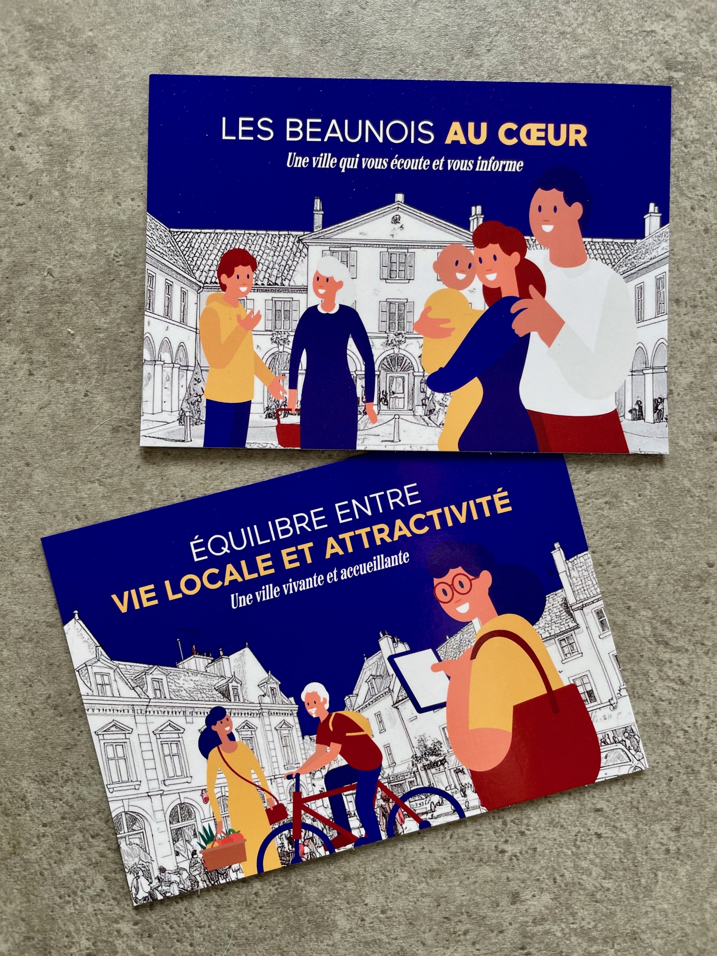 La liste “Beaune Ensemble” conduite par Marie-Laure Rakic s’est distinguée par une initiative de communication inhabituelle : la distribution de cartes postales à collectionner, chacune présentant une priorité de programme. Trois cartes, trois thèmes, diffusés progressivement au fil des semaines.