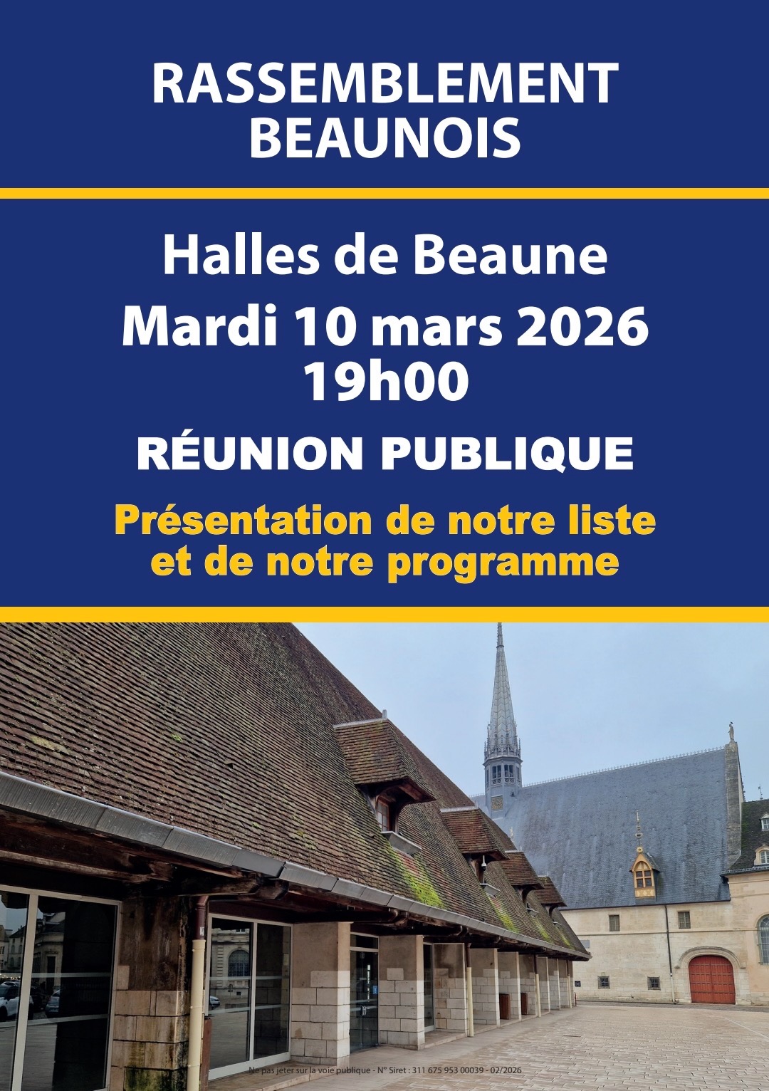 La principale séquence publique de la campagne est annoncée pour mardi 10 mars à 19 h, sous les Halles de Beaune. Cette réunion doit permettre la présentation officielle de la liste et du programme devant les habitants. Le candidat y détaillera notamment les axes de son projet municipal, déjà esquissés fin janvier à travers la présentation de douze priorités couvrant plusieurs thématiques locales.