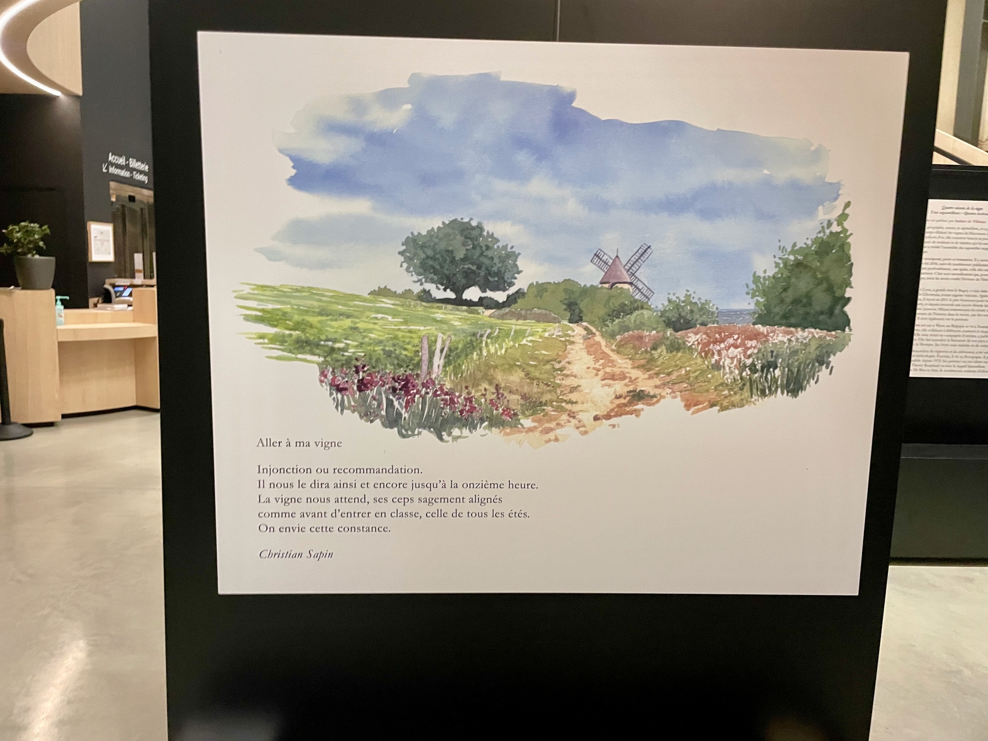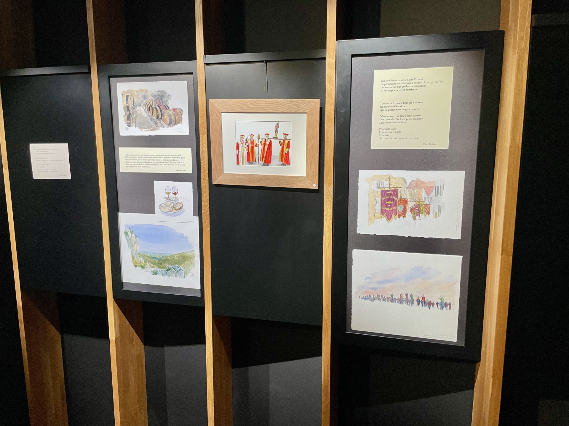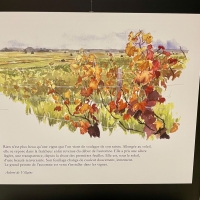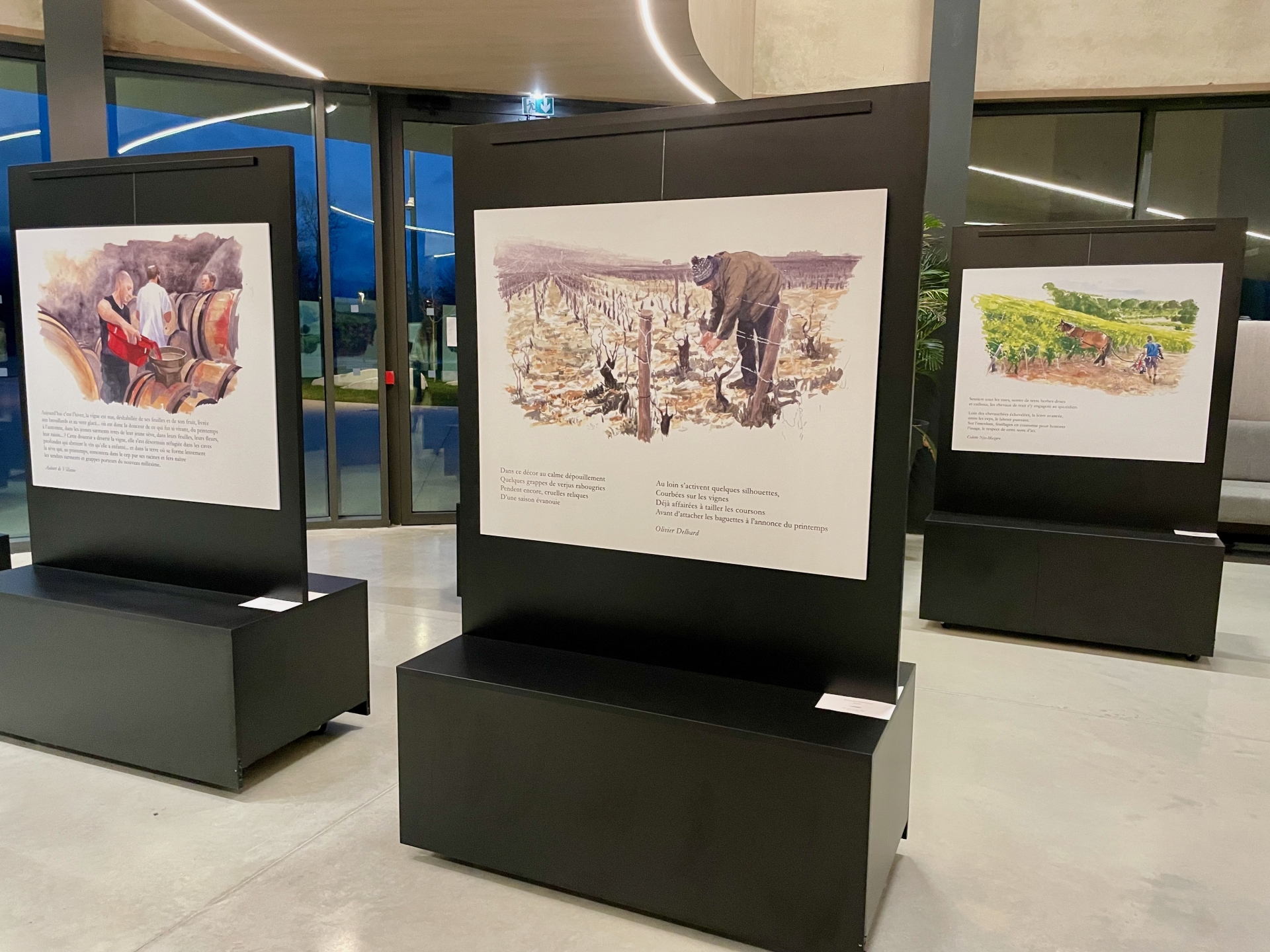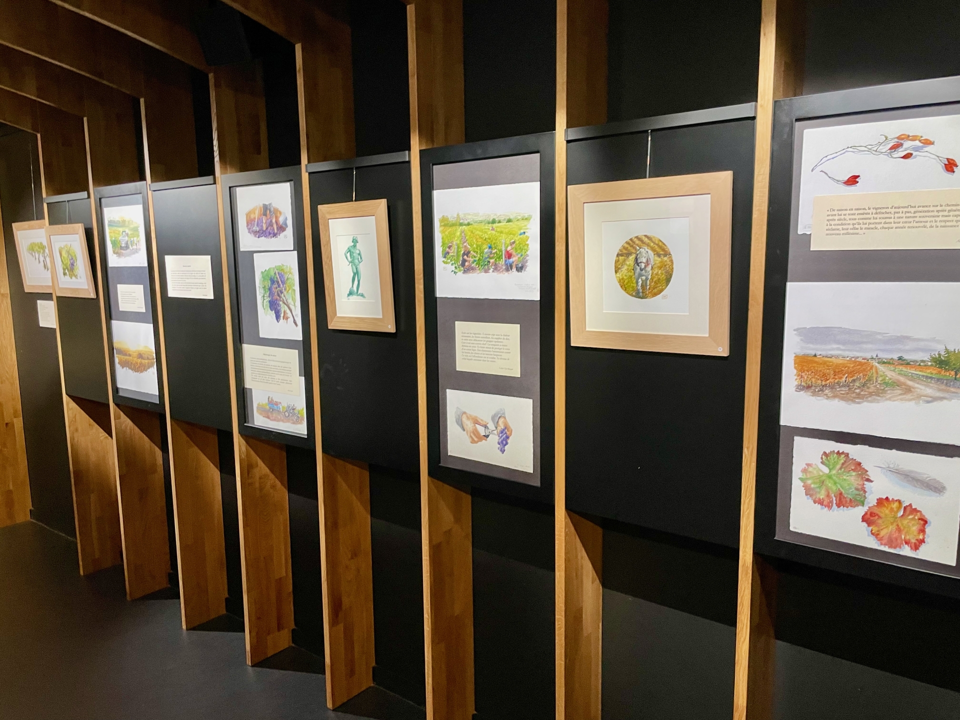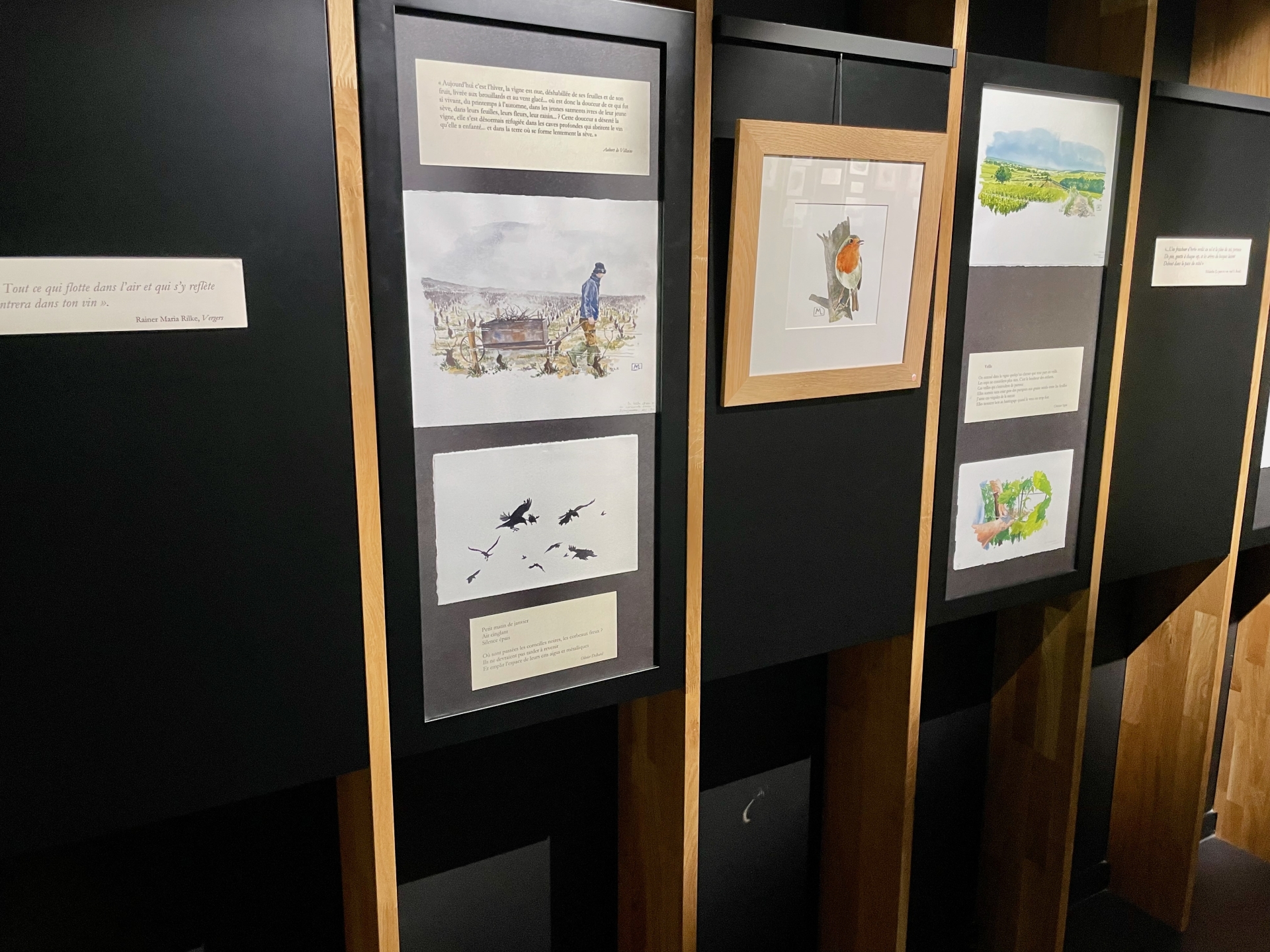 L’exposition se déploie comme une enfilade chronologique : printemps, été, automne, hiver. Chaque saison correspond à un carnet, à une ambiance, à un rythme de travail dans les vignes. Les textes et les aquarelles se répondent, tissant un dialogue entre regard pictural et voix poétique.