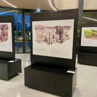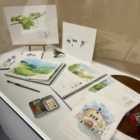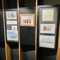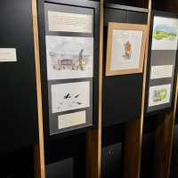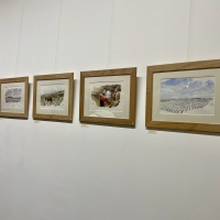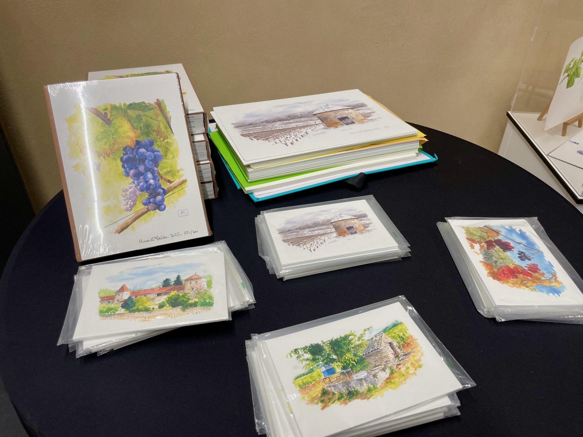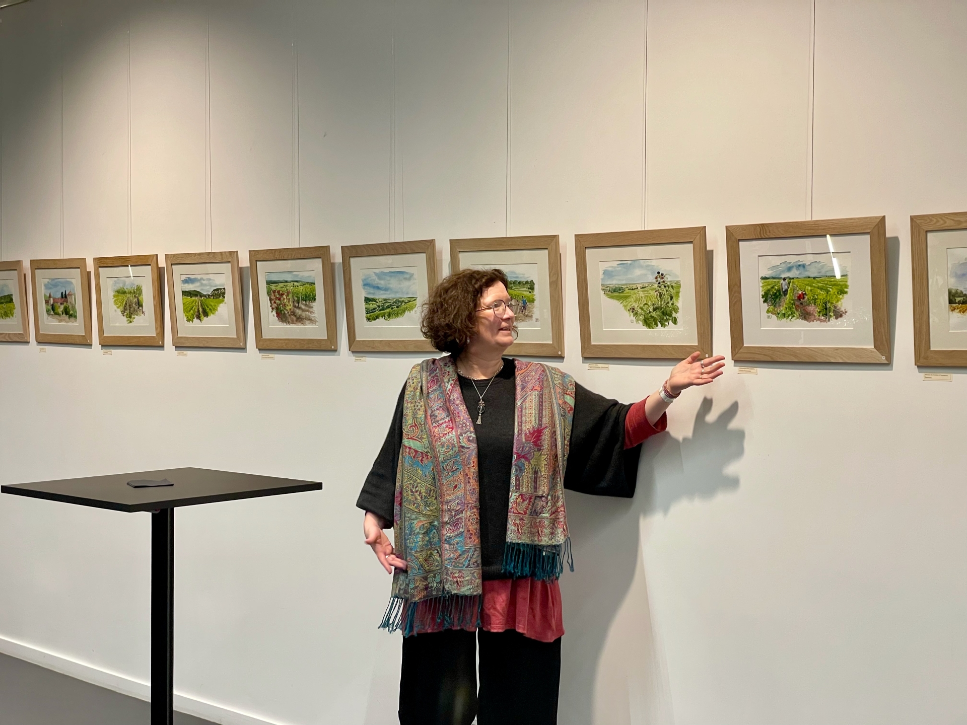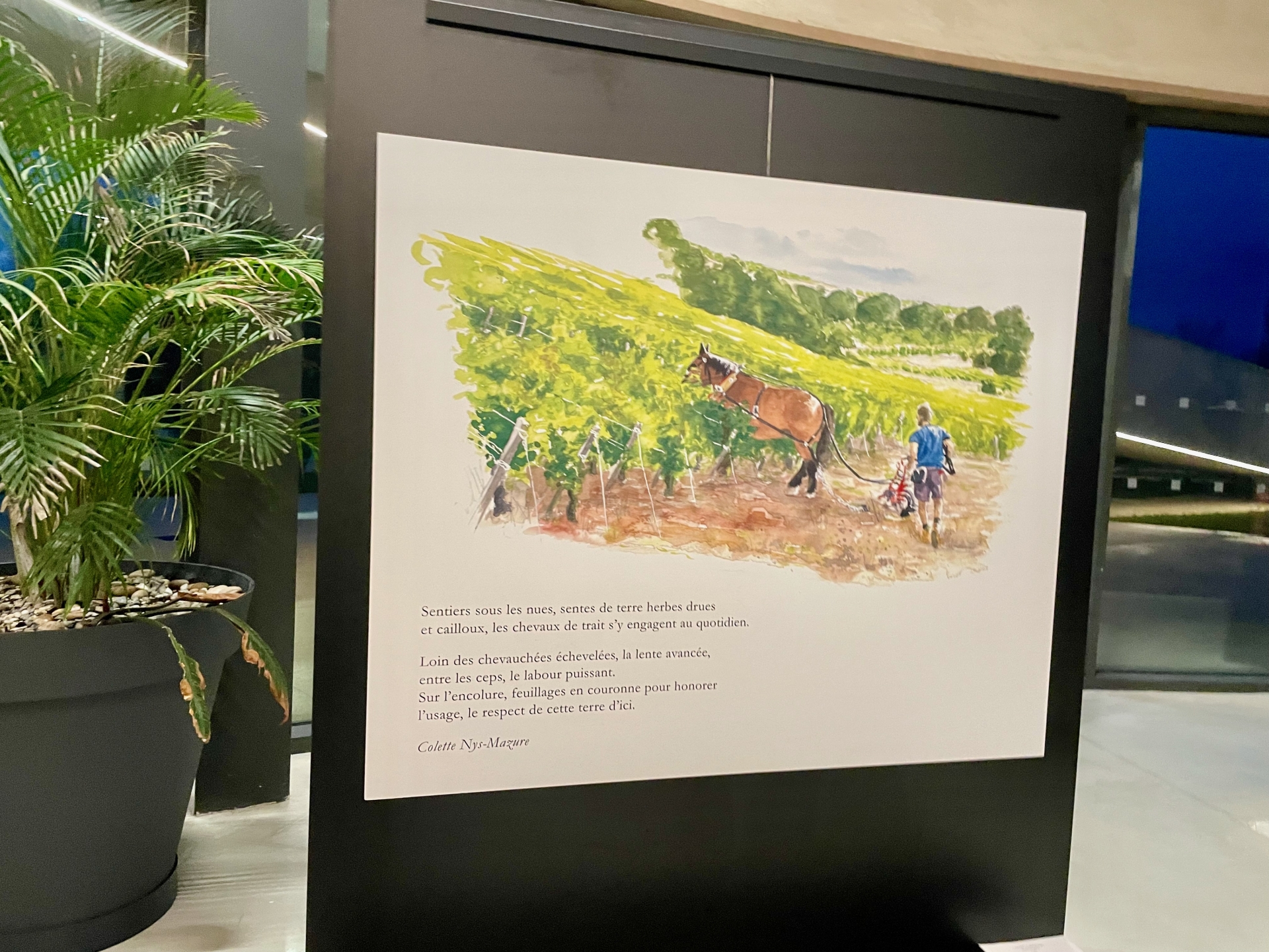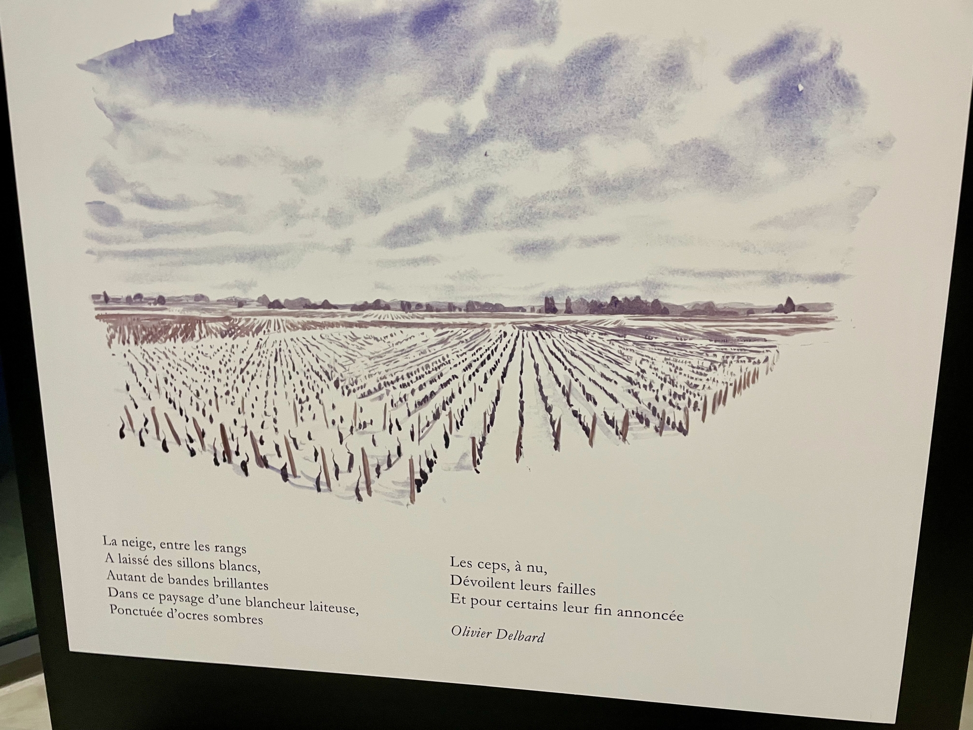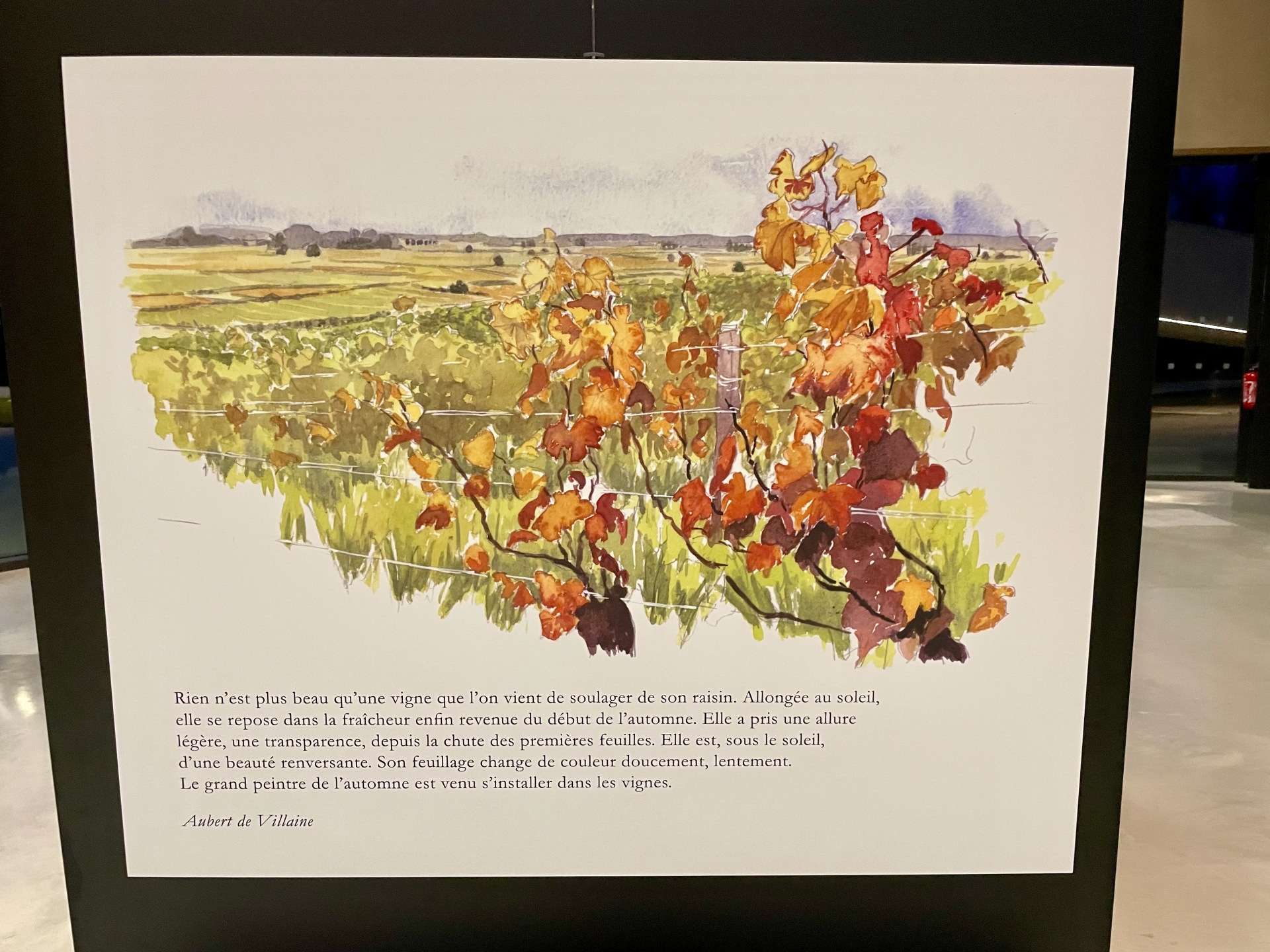 L’exposition se déploie comme une enfilade chronologique : printemps, été, automne, hiver. Chaque saison correspond à un carnet, à une ambiance, à un rythme de travail dans les vignes. Les textes et les aquarelles se répondent, tissant un dialogue entre regard pictural et voix poétique.