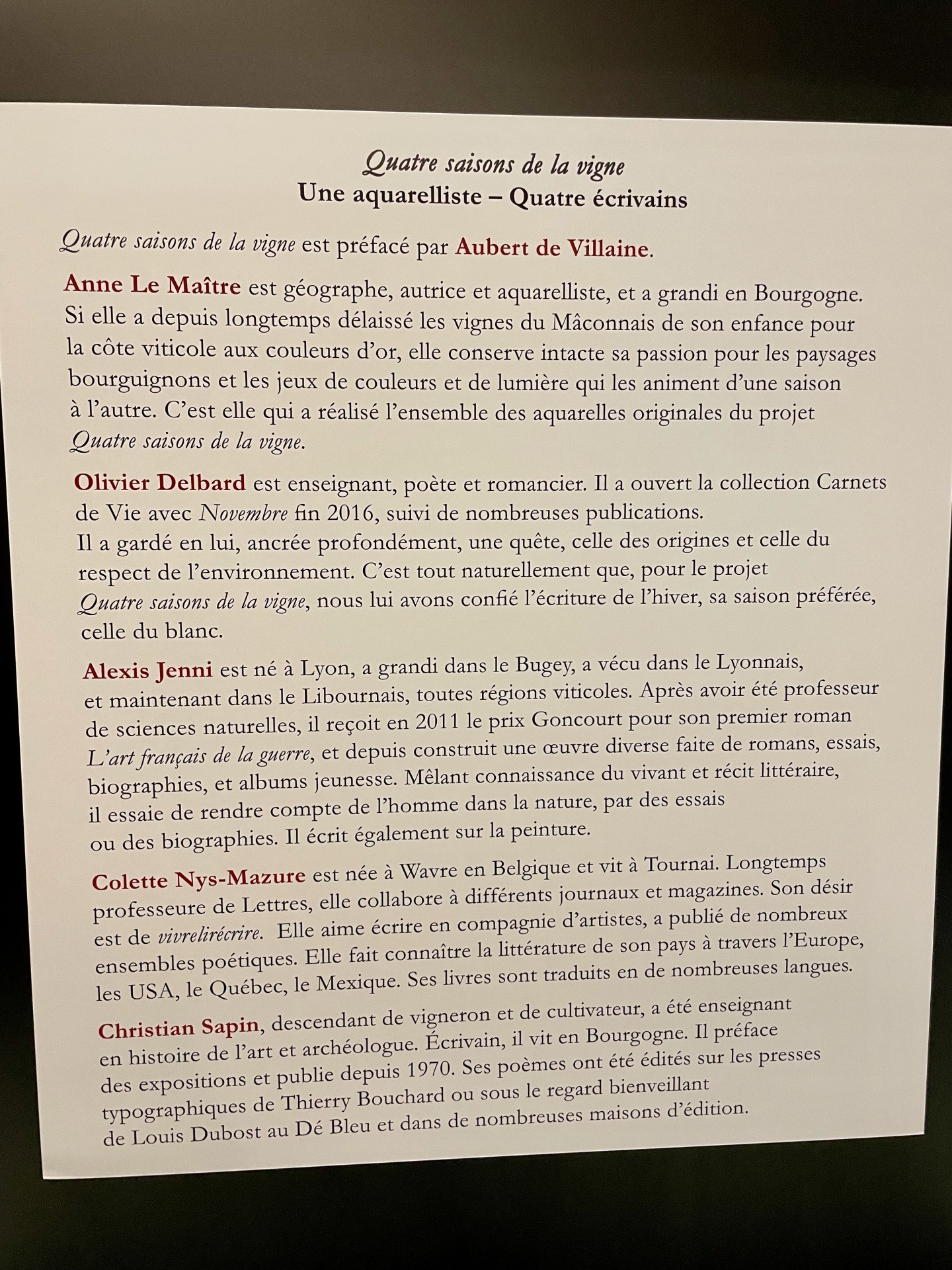 Quatre voix, quatre sensibilités, pour accompagner les aquarelles d’Anne Le Maître et donner chair aux saisons de la vigne.