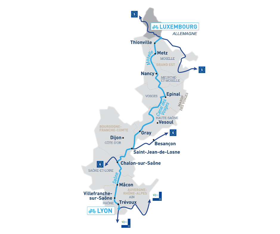 Longue de près de 700 kilomètres entre Apach, à la frontière luxembourgeoise, et Lyon, La Voie Bleue serpente au fil de l’eau en longeant la Moselle, le canal des Vosges puis la Saône jusqu’au Rhône. En Côte-d’Or, elle traverse le département du nord au sud, de Heuilley-sur-Saône à Seurre, offrant un parcours privilégié au cœur du Val de Saône.