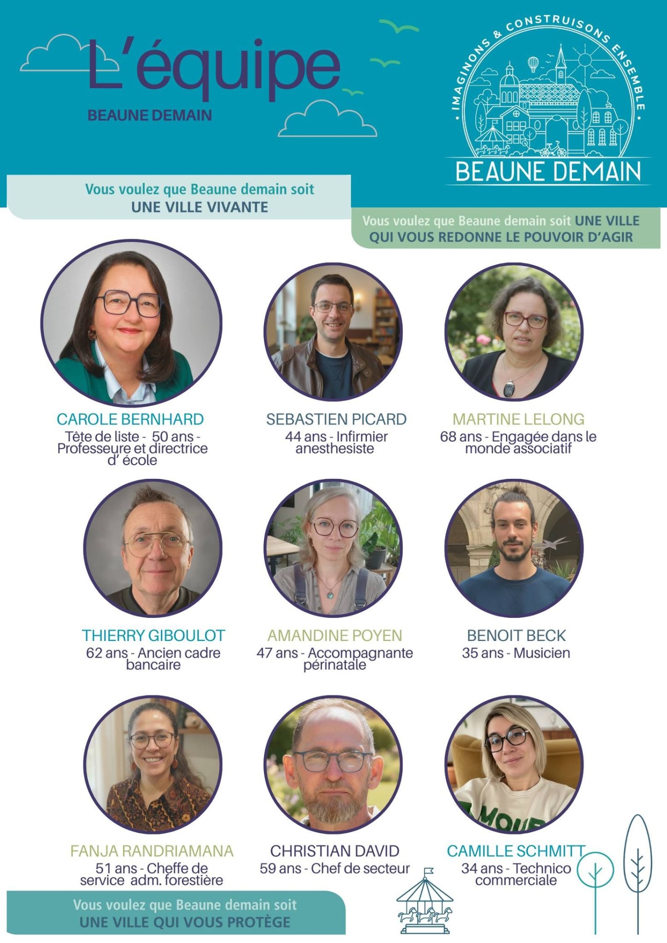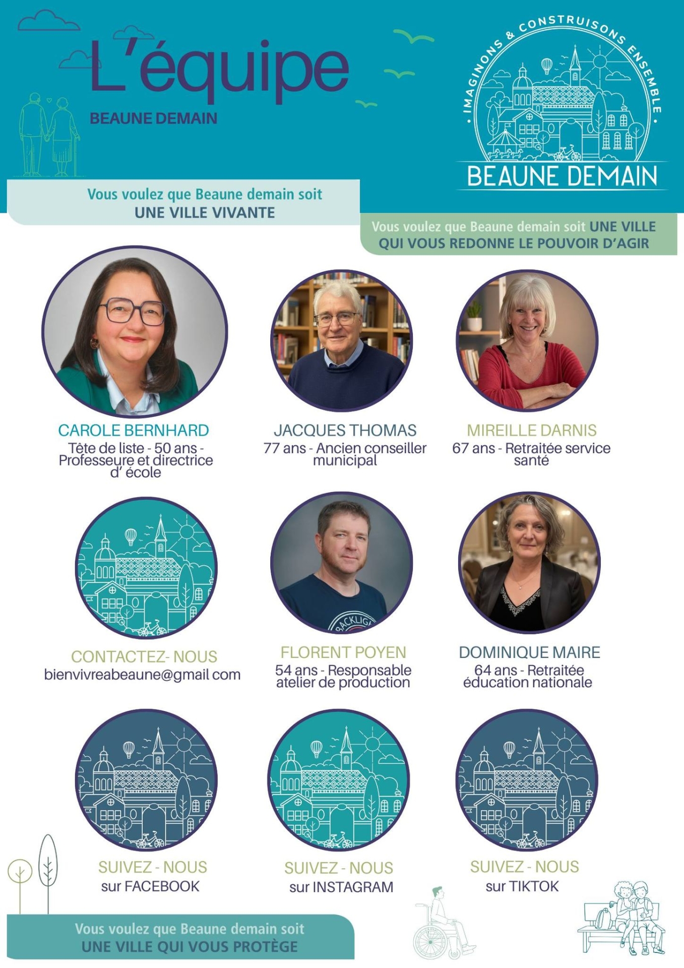 Sous le slogan « Une ville qui vous protège », Beaune Demain met en avant une démarche participative et citoyenne. L’équipe affirme vouloir construire son projet en lien direct avec les habitants. « Nous avons hâte de discuter avec vous », indique Carole Bernhard, invitant les Beaunois à venir rencontrer la liste sur le marché et lors des réunions publiques à venir.