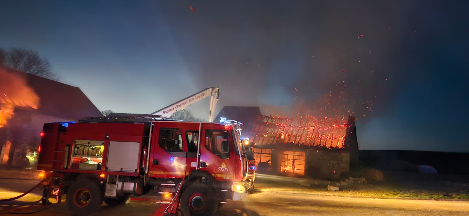 À l’arrivée des secours, deux corps de ferme étaient totalement embrasés. Le bilan humain fait état d’une victime. À l’heure où nous écrivons ces lignes, l’attaque du feu est toujours en cours.